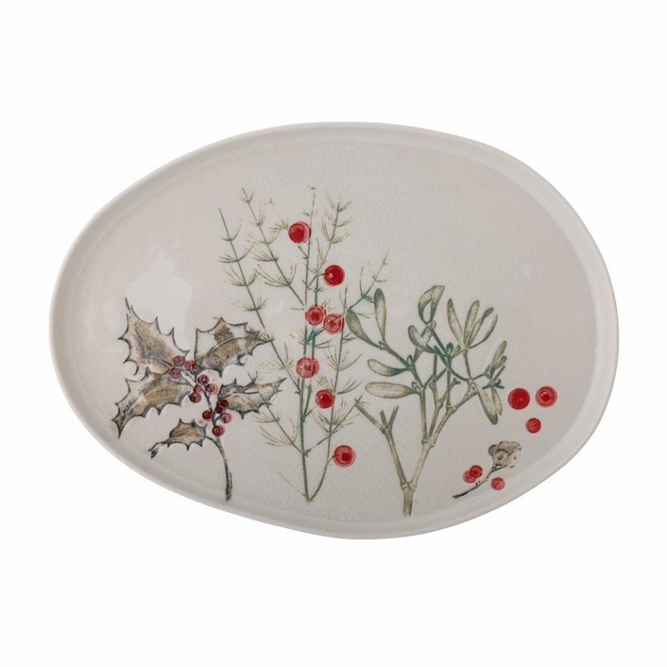 Precioso plato de servir fabricado en gres en colores naturales con un delicado estampado floral navideño en su esmalte craquelado. Alegrará cualquier mesa navideña.