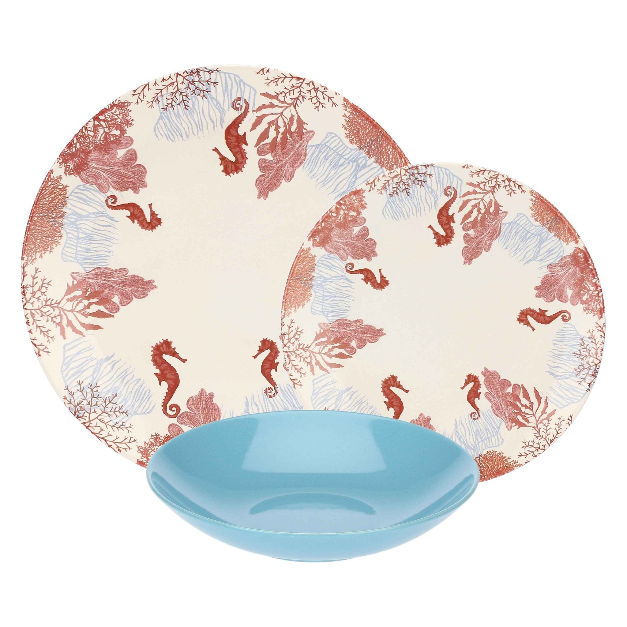 Preciosa vajilla para 6 personas compuesta por 18 elementos que deleita con originales ilustraciones del mar y colores atrevidos, fabricado en cerámica lo que significa que no solo tiene un aspecto bonito, sino que también es duradero y fácil de mantener.