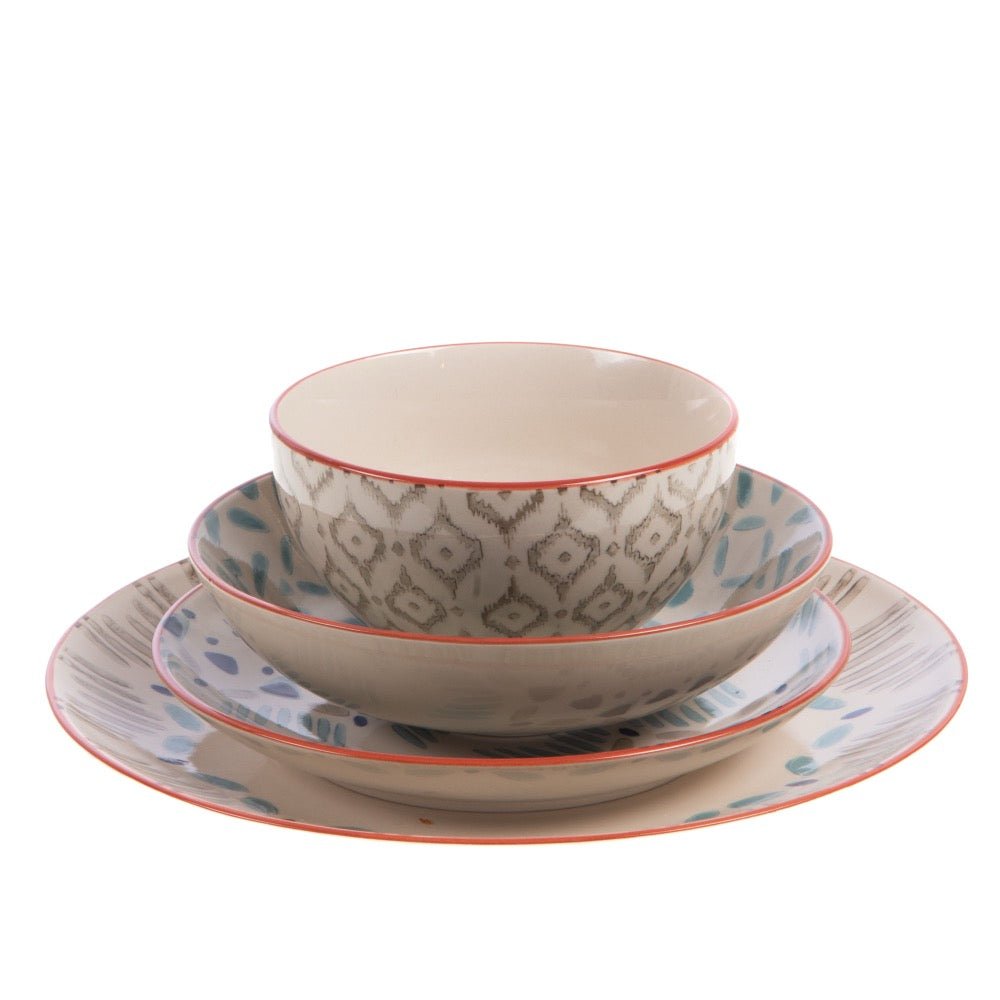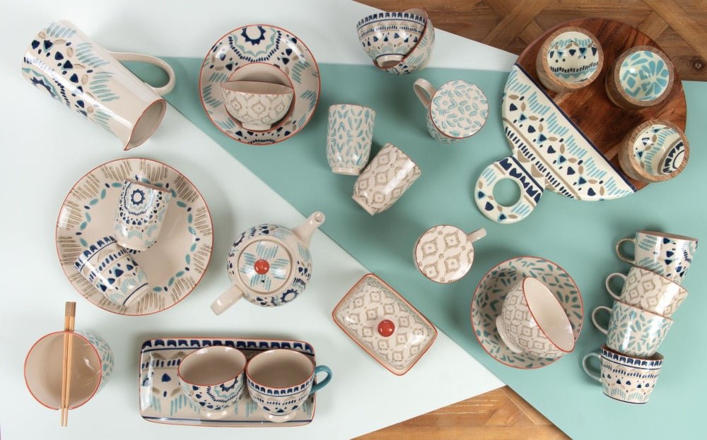 Inspirada en la frescura del mar y la claridad de los cielos, la vajilla Jubail está fabricada en gres con un esmaltado en tonos turquesa y blanco que aporta ligereza y naturalidad a la mesa. Su acabado artesanal y combinación de colores suaves la convierten en una opción ideal para comidas relajadas, tanto en interiores como al aire libre. Perfecta para dar un toque mediterráneo, elegante y atemporal a cualquier ocasión.