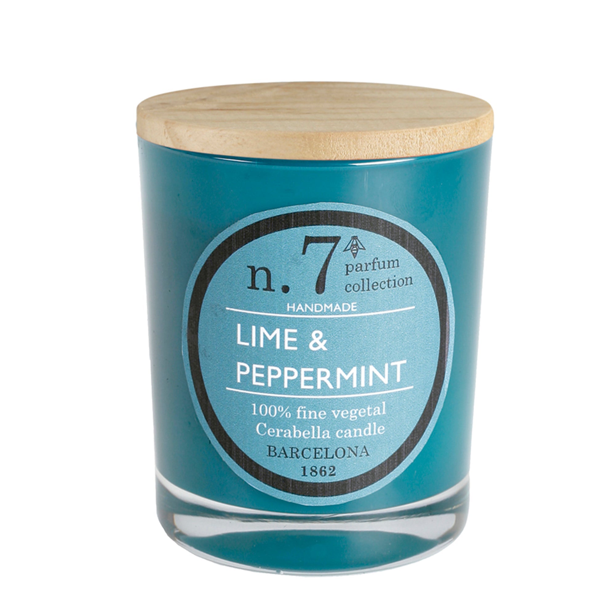 La vela Cerabella nº 7 con una fragancia intensa de lima y mentaIncluye una tapa de madera y un elegante estuche negro. Disponible en dos medidas.
