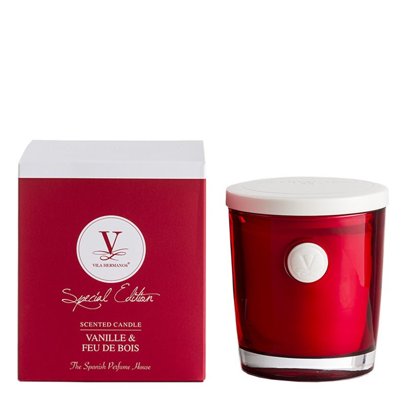 La vela Vanilla Feu De Bois está compuesta por notas dulces, ahumadas y vegetales. Entre sus notas de corazón están el cedro, la nuez moscada, el cuero, la naranja, el almizcle, y entre las notas de fondo están la madera quemada, la vainilla, el pachuli y el ámbar. El vaso de la vela es rojo, haciendo que pertenezca a la colección "Cameo rojo".