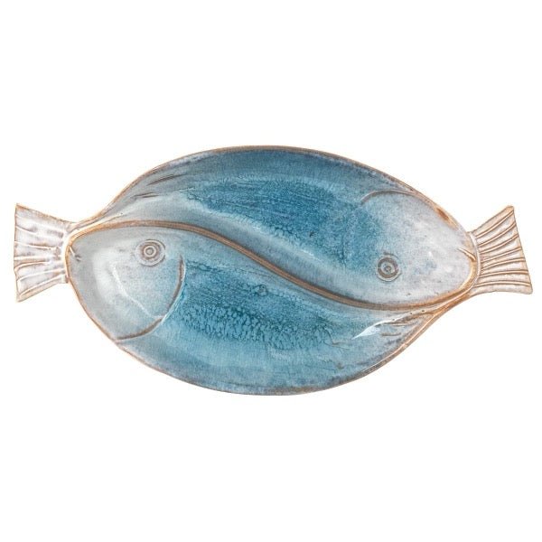 Inspirada en la armonía del mar, esta bandeja en forma de dos peces unidos está fabricada en gres y acabada en un vibrante tono turquesa. Su diseño fluido y simbólico evoca equilibrio y conexión, convirtiéndola en una pieza decorativa ideal para espacios costeros, bohemios o con alma mediterránea. Perfecta para presentar pequeños objetos, aperitivos o simplemente decorar con estilo y frescura.
