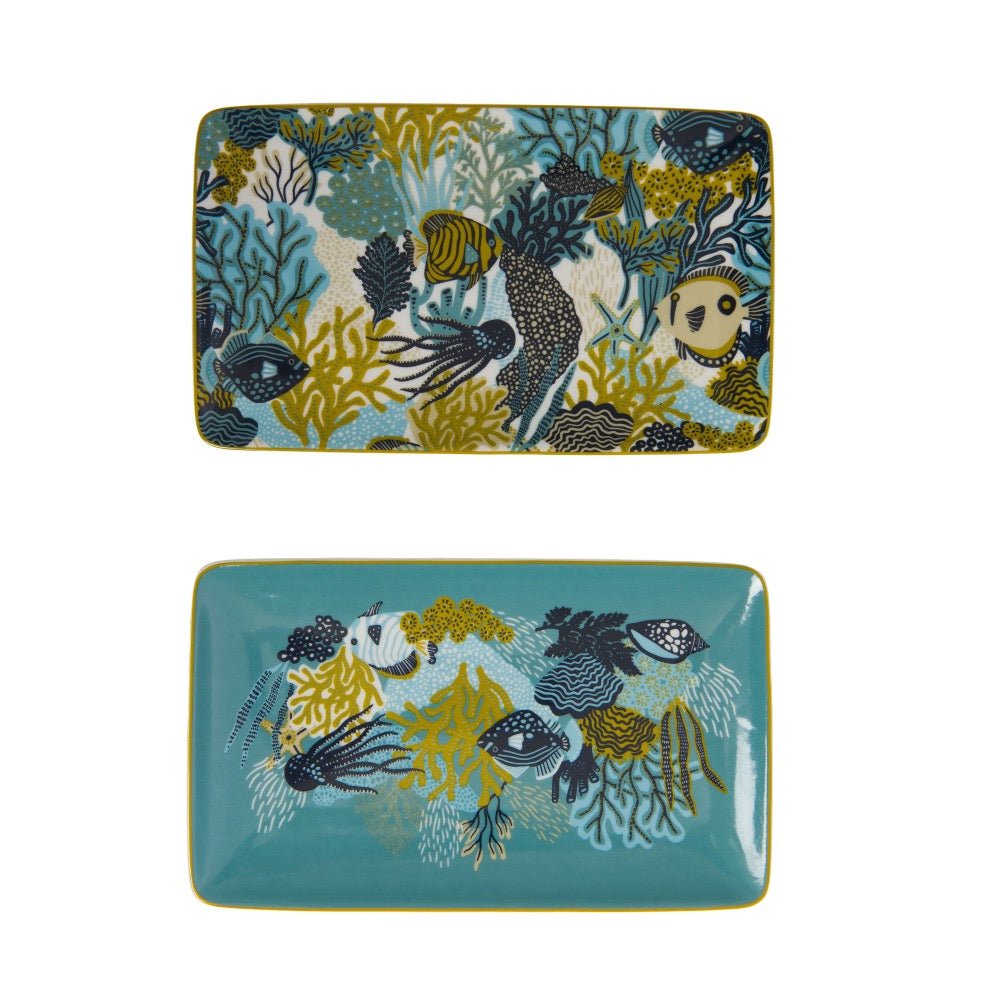 Elegante bandeja portallaves fabricada en porcelana de alta calidad, decorada con delicados motivos de animales marinos en tonos azul profundo. Su diseño sofisticado y marino aporta un toque fresco y sereno a cualquier entrada o espacio, ideal para mantener tus llaves organizadas con estilo y personalidad.