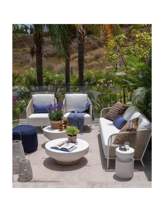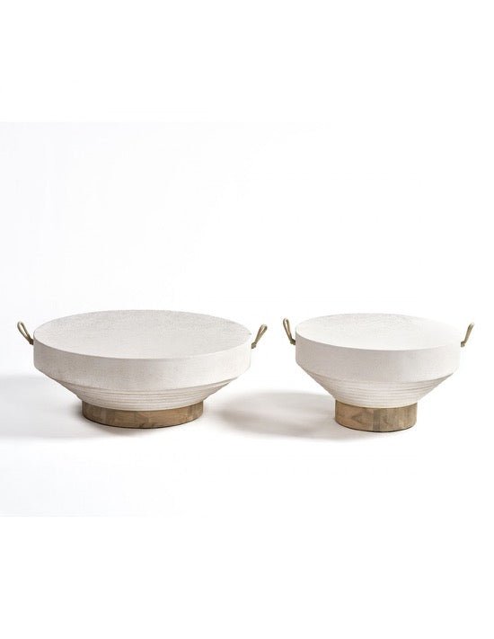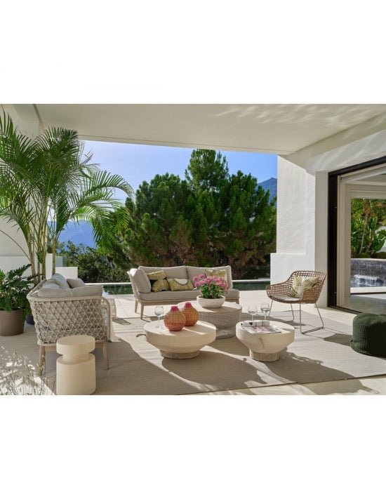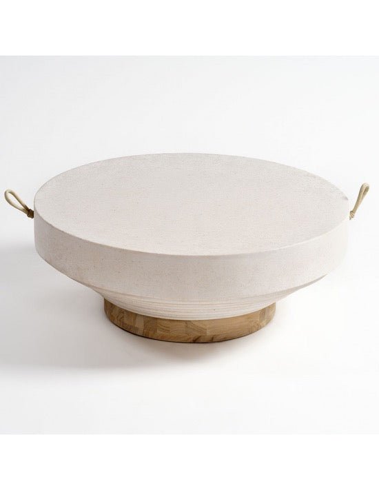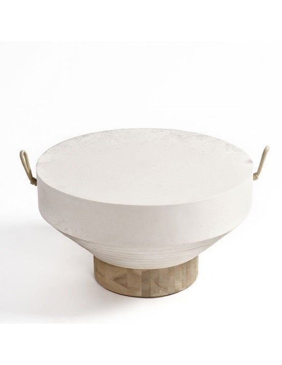 Mesa de centro redonda para exterior fabricada en fibra de vidrio color cemento blanco con base de madera de teca envejecida. Disponible en dos medidas diferentes.