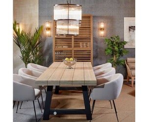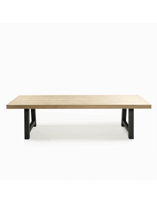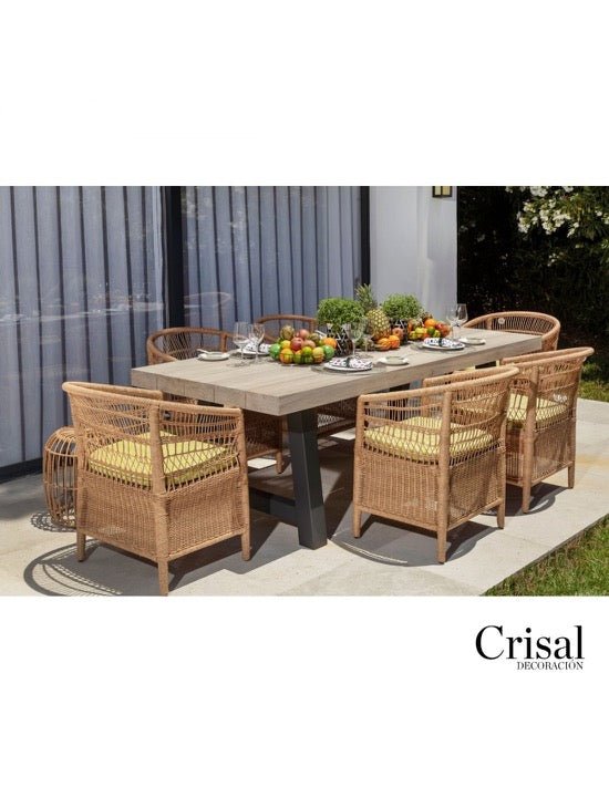 Mesa de exterior de metal color grafito y teca. Esta mesa de comedor con materiales de exterior como la teca envejecida es una pieza ideal para tu porche o jardín.