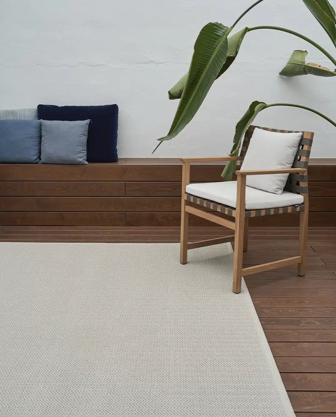 Wonderful rectangular rug suitable for indoor and outdoor use, made on a flat weave loom and with a UV treatment incorporated into the fibres that allows its use indoors and outdoors with colour fastness to light. Suitable for use with underfloor heating.