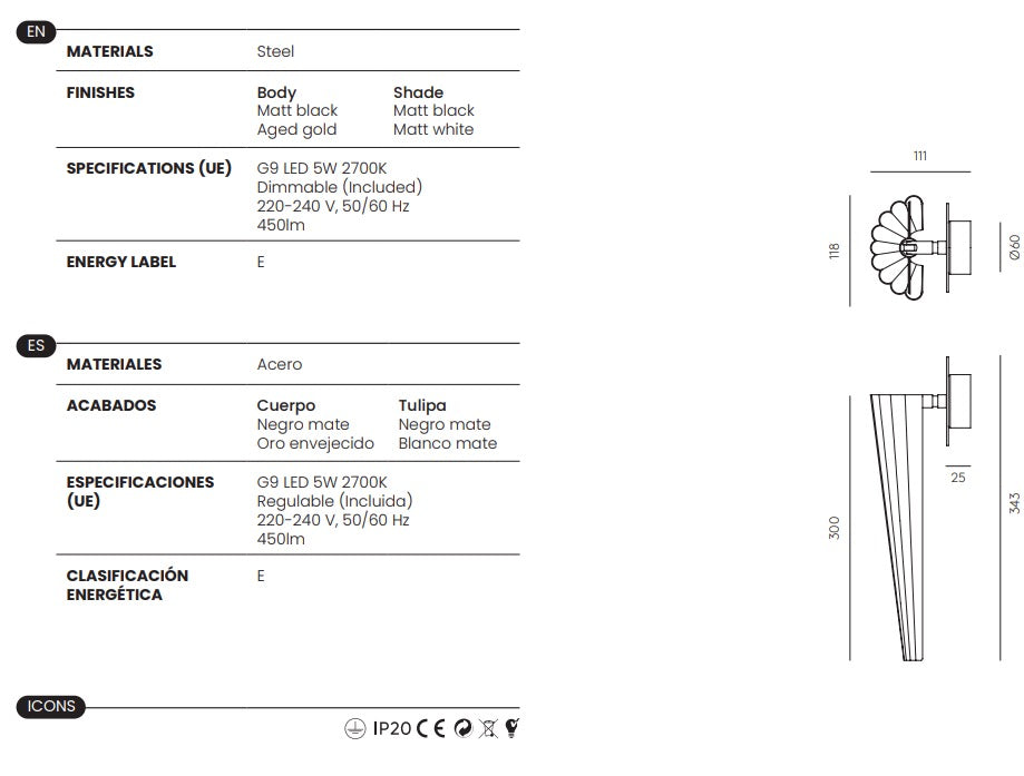 Bulb : G9 LED 5W 2700K 450lm. Dimmable.