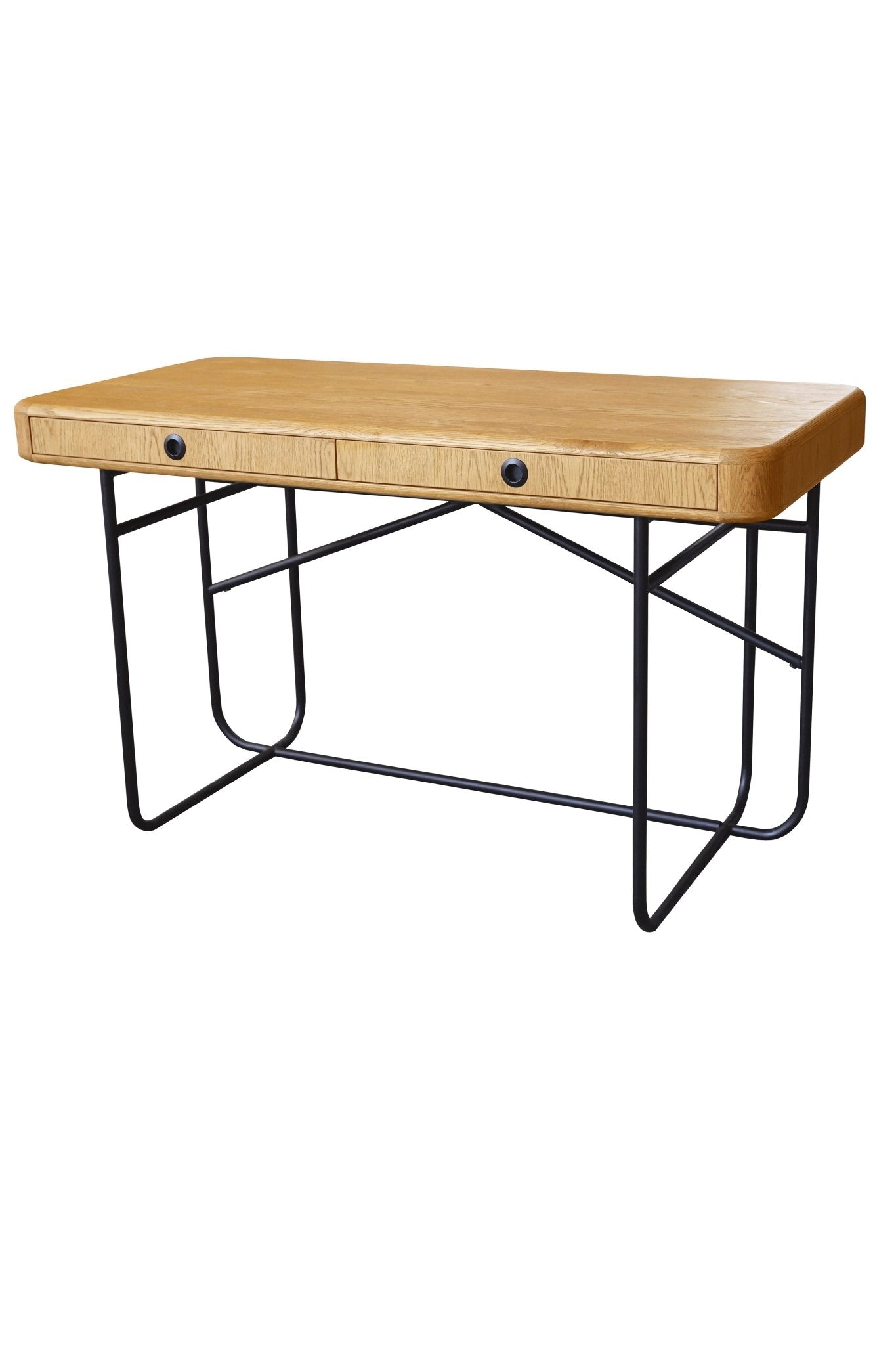 Office table or desk made of oak wood with black iron leg structure.