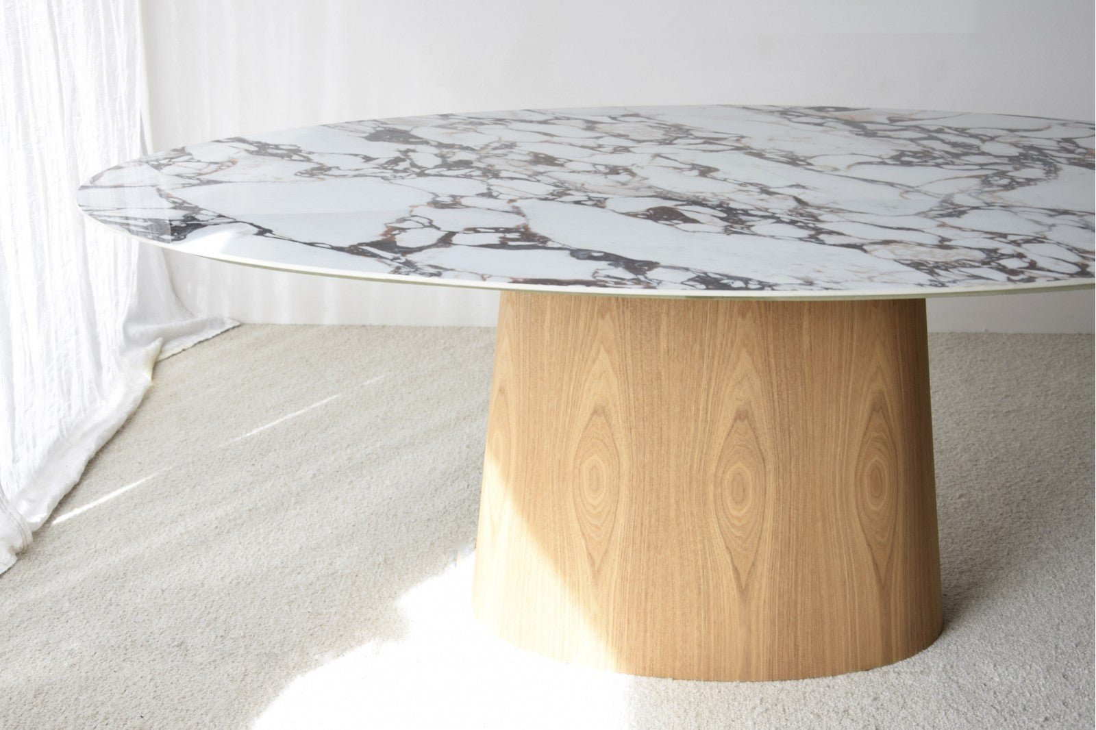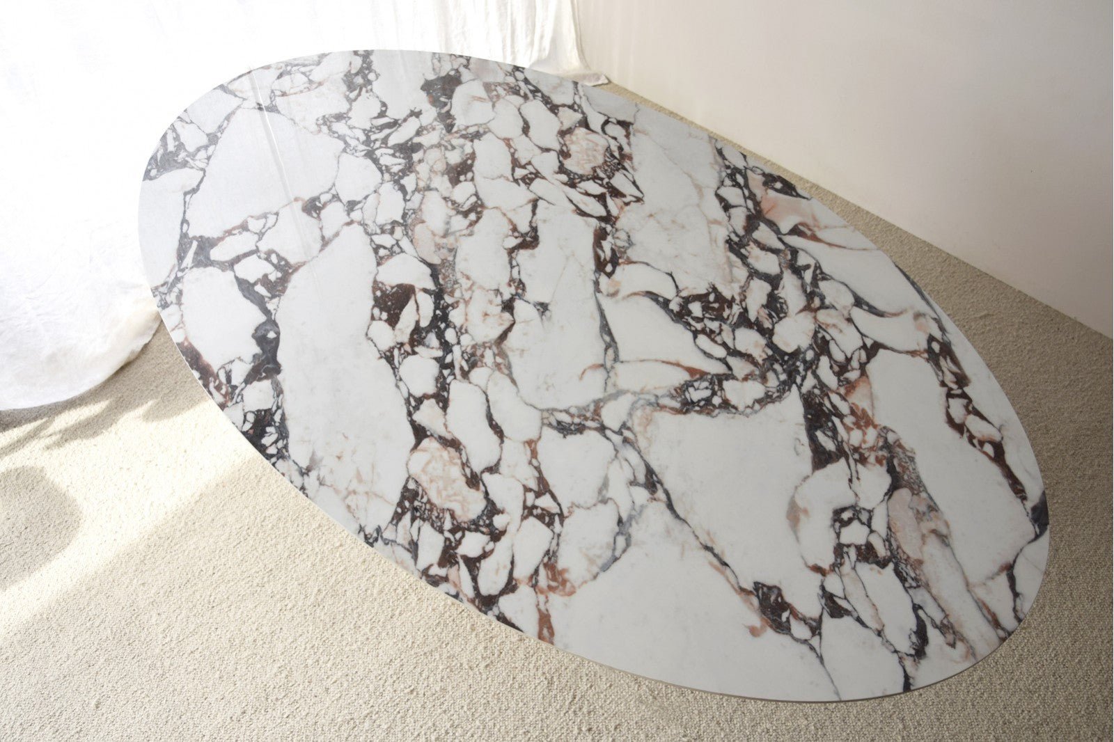 Oval dining table with a ceramic top, marble finish with a design in different shades of brown, violet, red, on a white background with a gloss finish. The base of the table is made of ash wood.