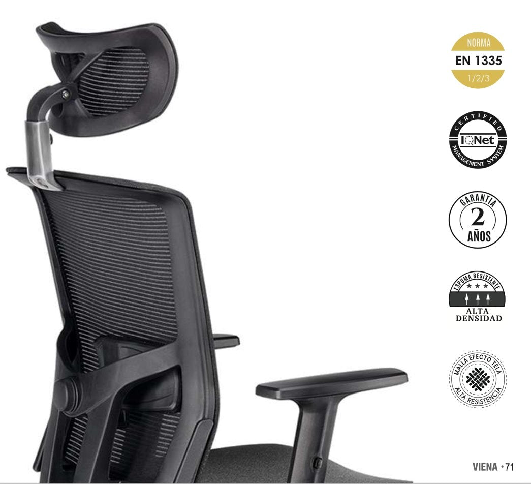 The Euromof Vienna executive chair combines advanced ergonomics and contemporary design to offer a professional comfort experience . Its high backrest with technical mesh fabric, adjustable lumbar support, and standard headrest ensure optimal posture throughout the workday.