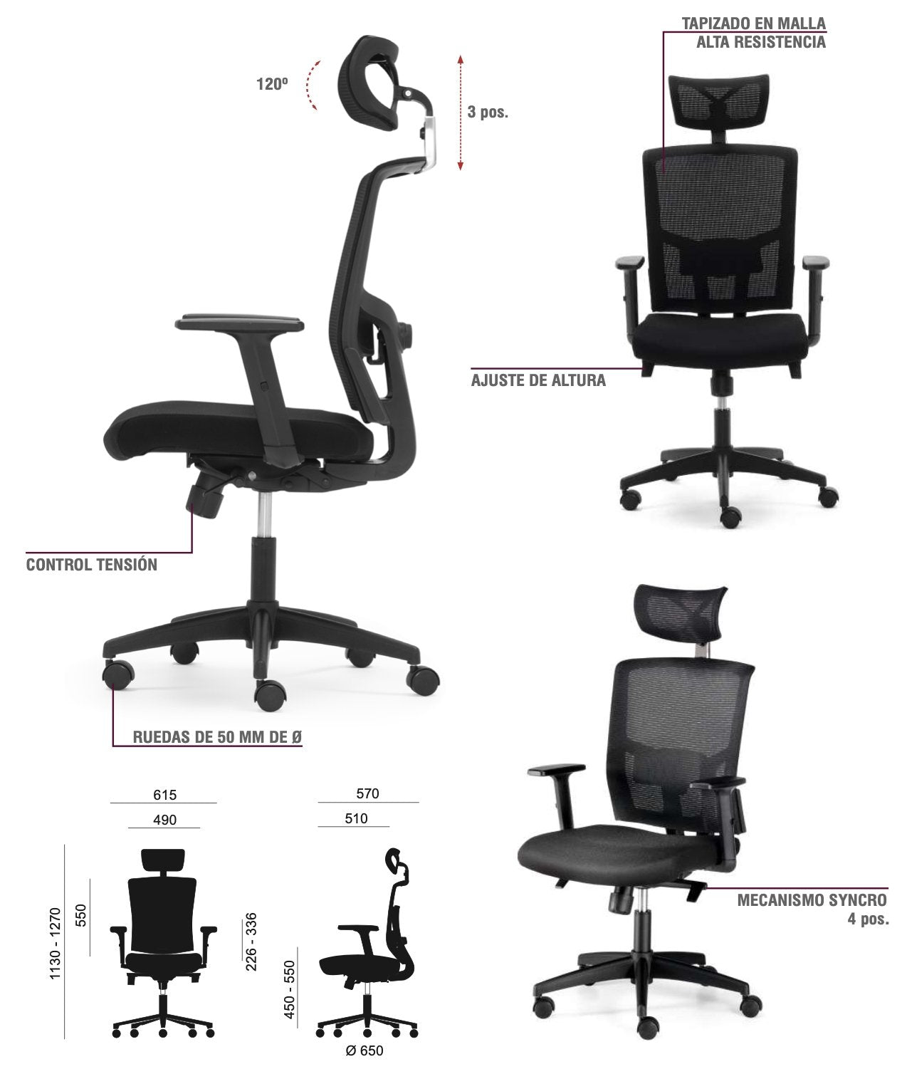 - Syncron Mechanism : synchronized tilt between backrest (15°) and seat (5°), with 4-position lock .