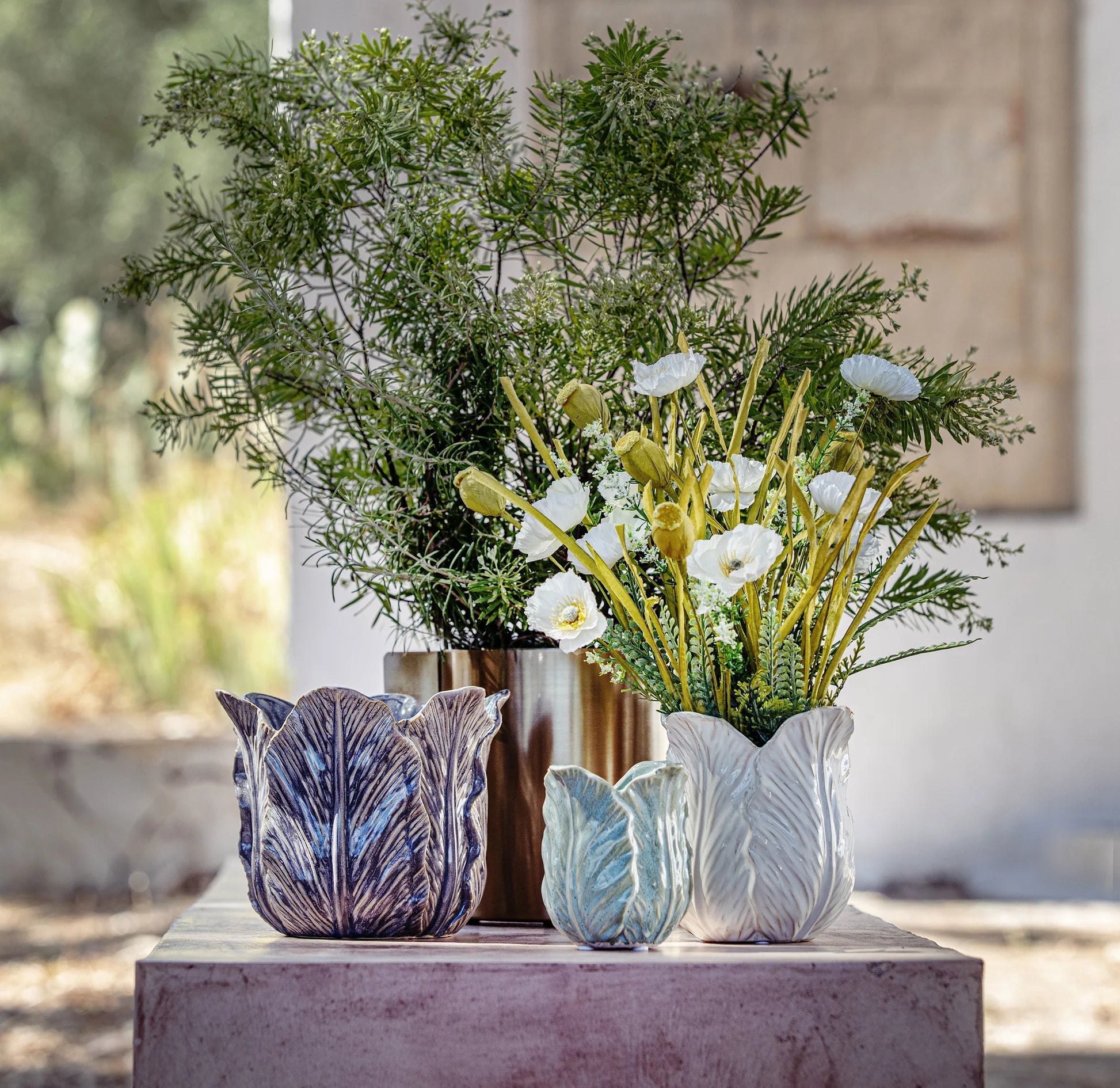 Colorful pottery made of ceramic in white, yellow and green with flower drawings.