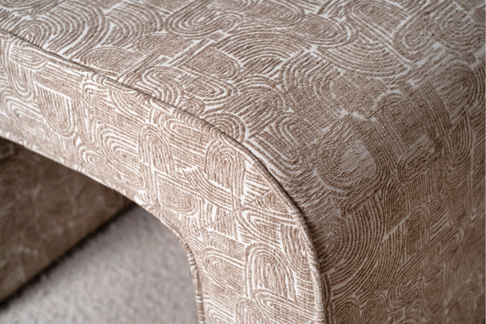 Oval design console has a black metal structure with a white and gray ceramic marble top or black synthetic stone veined in ocher tones, the body of the piece is made of DM in a sand-gray tone. Assembly required.