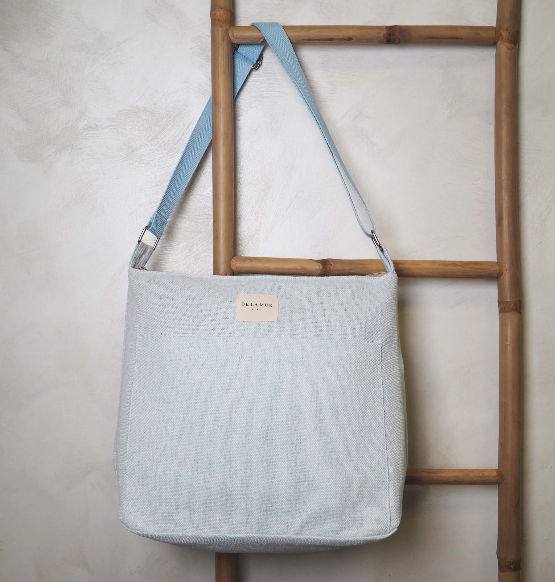 Medium-sized shoulder bag with long adjustable strap. Made of light blue sack-type fabric. Inner pocket with zipper. Light blue cotton herringbone ribbon handle. For proper maintenance, we recommend washing it in cold water and not using a dryer.