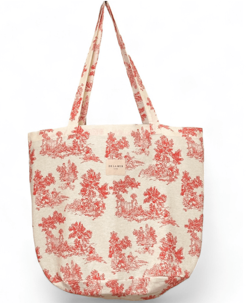 Large vintage-style shopper bag with shoulder straps. Made from fine cotton and polyester fabric in beige with a pink print. For proper care, we recommend hand washing in cold water and not using a dryer.