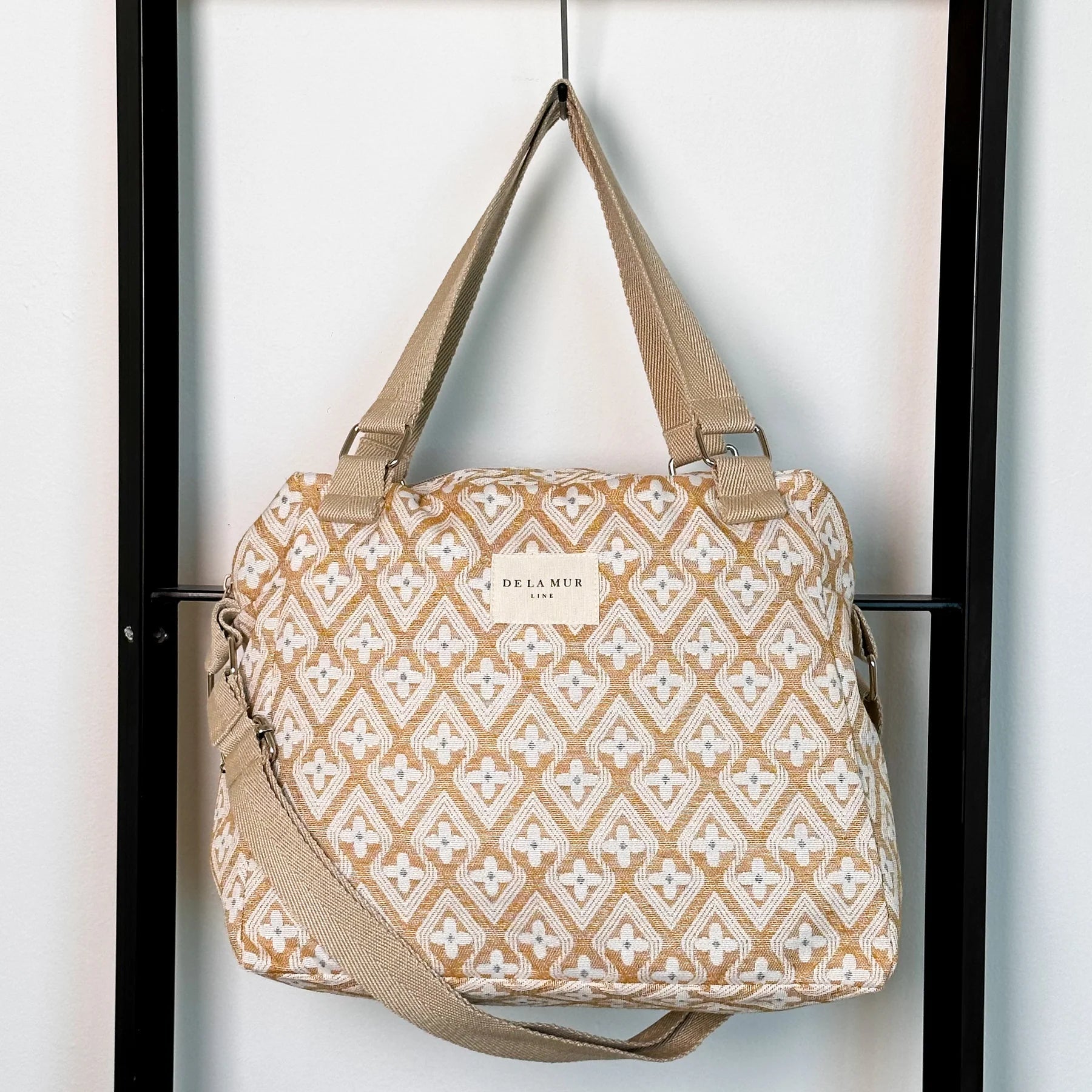 Medium crossbody bag with a long, adjustable beige cotton herringbone webbing strap. Featuring a mustard-colored geometric print. Zip top closure. Two front zippered pockets. Lined with thick gray fabric on the inside. One interior zippered pocket. For proper care, we recommend hand washing in cold water and not using a dryer.