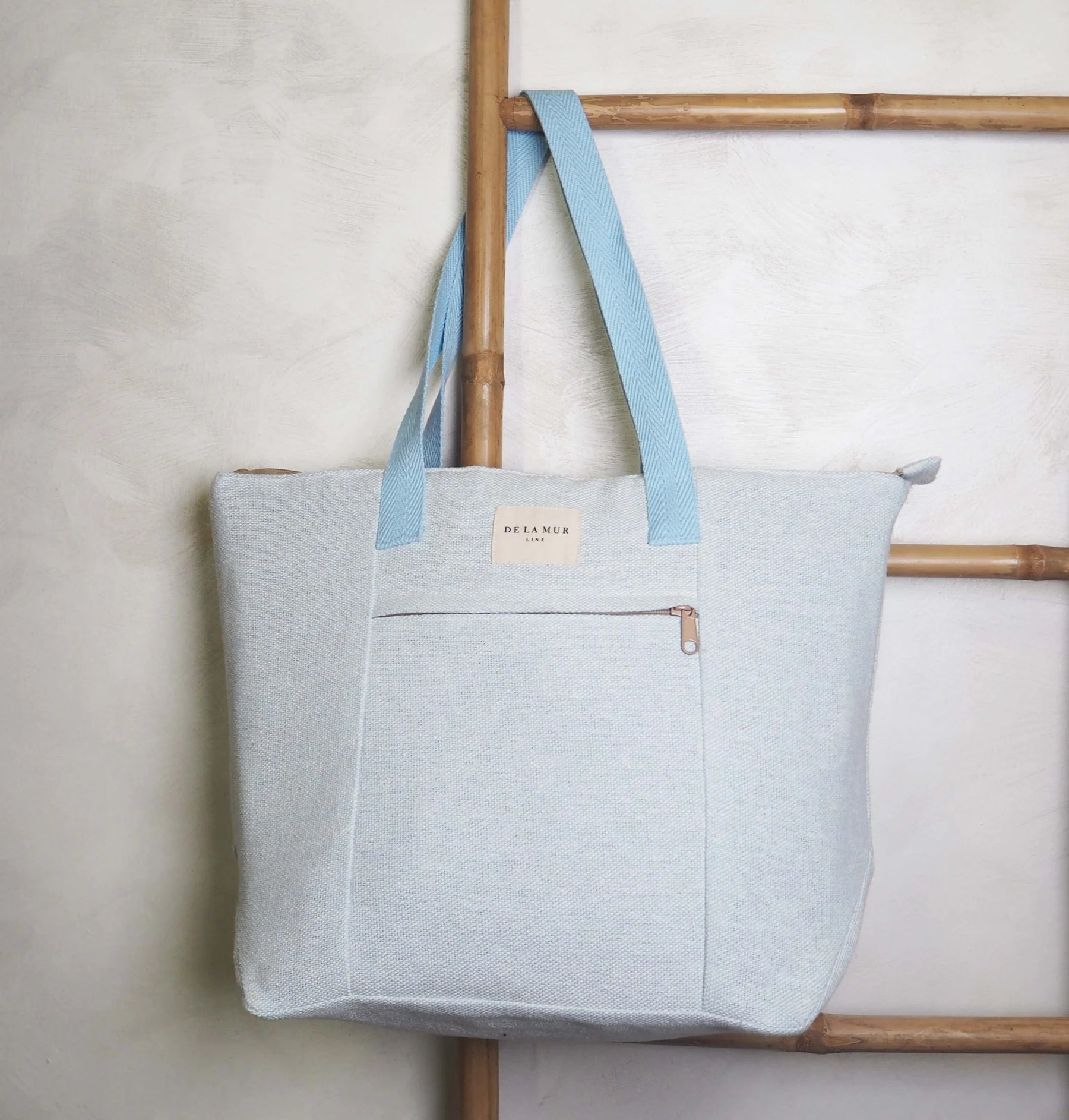 Shopper-style bag with medium-sized handles on the top. Made of light blue sack-type fabric. Interior and exterior pockets with zipper. Light blue cotton herringbone ribbon handle. For proper maintenance, we recommend washing it cold and not using a dryer.