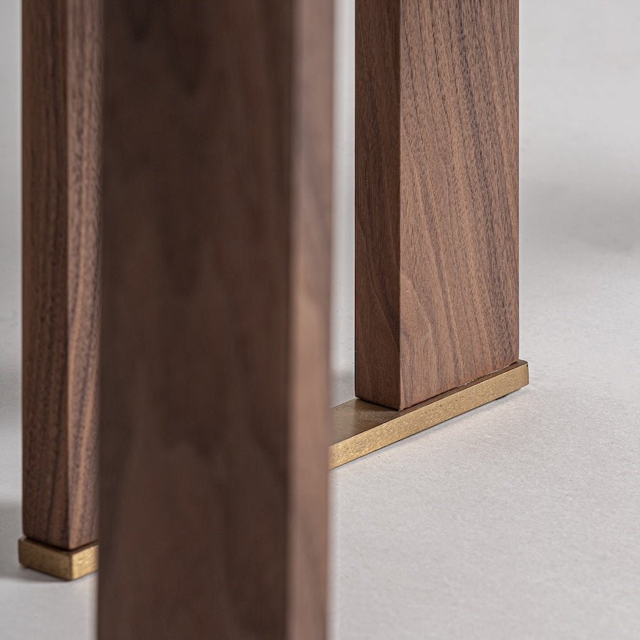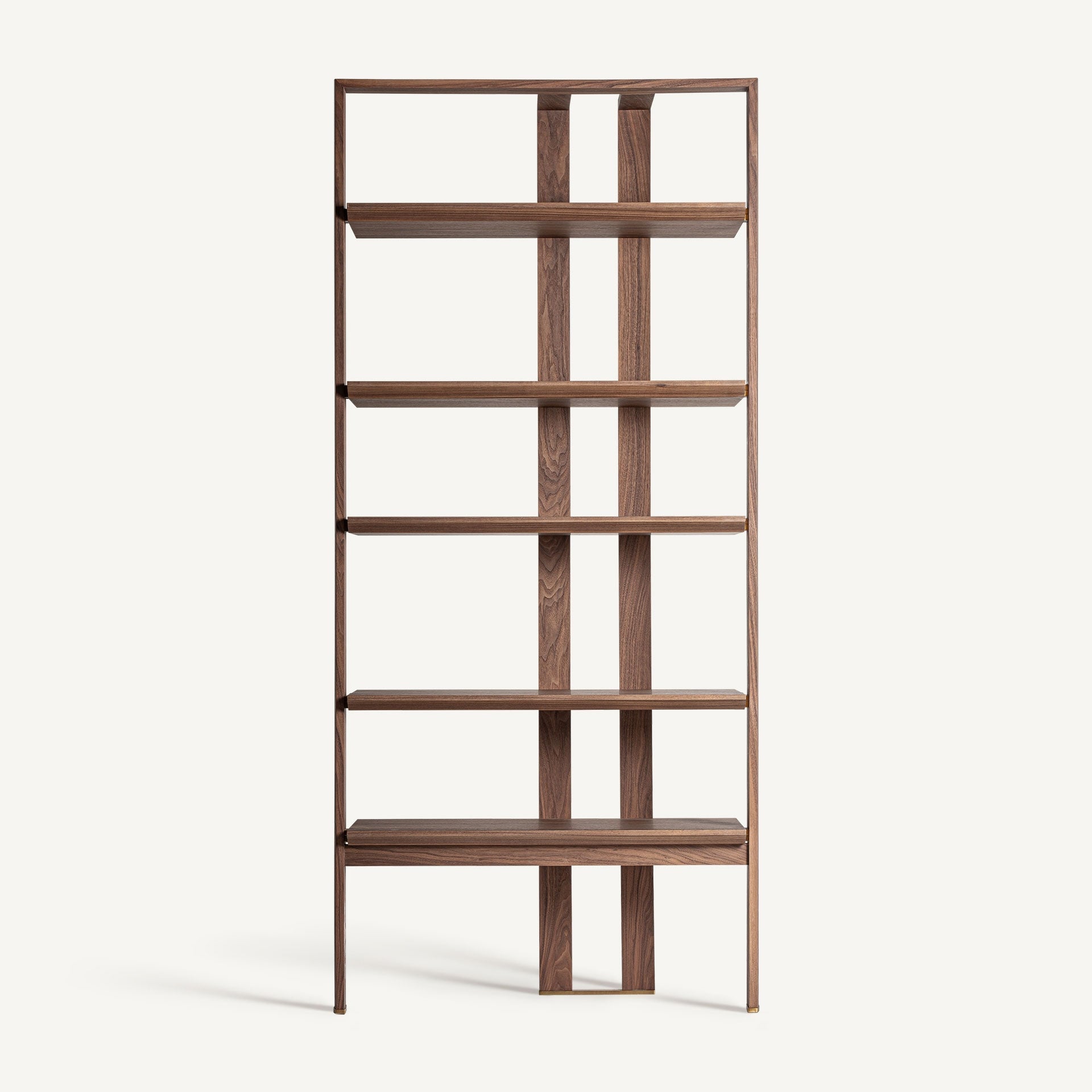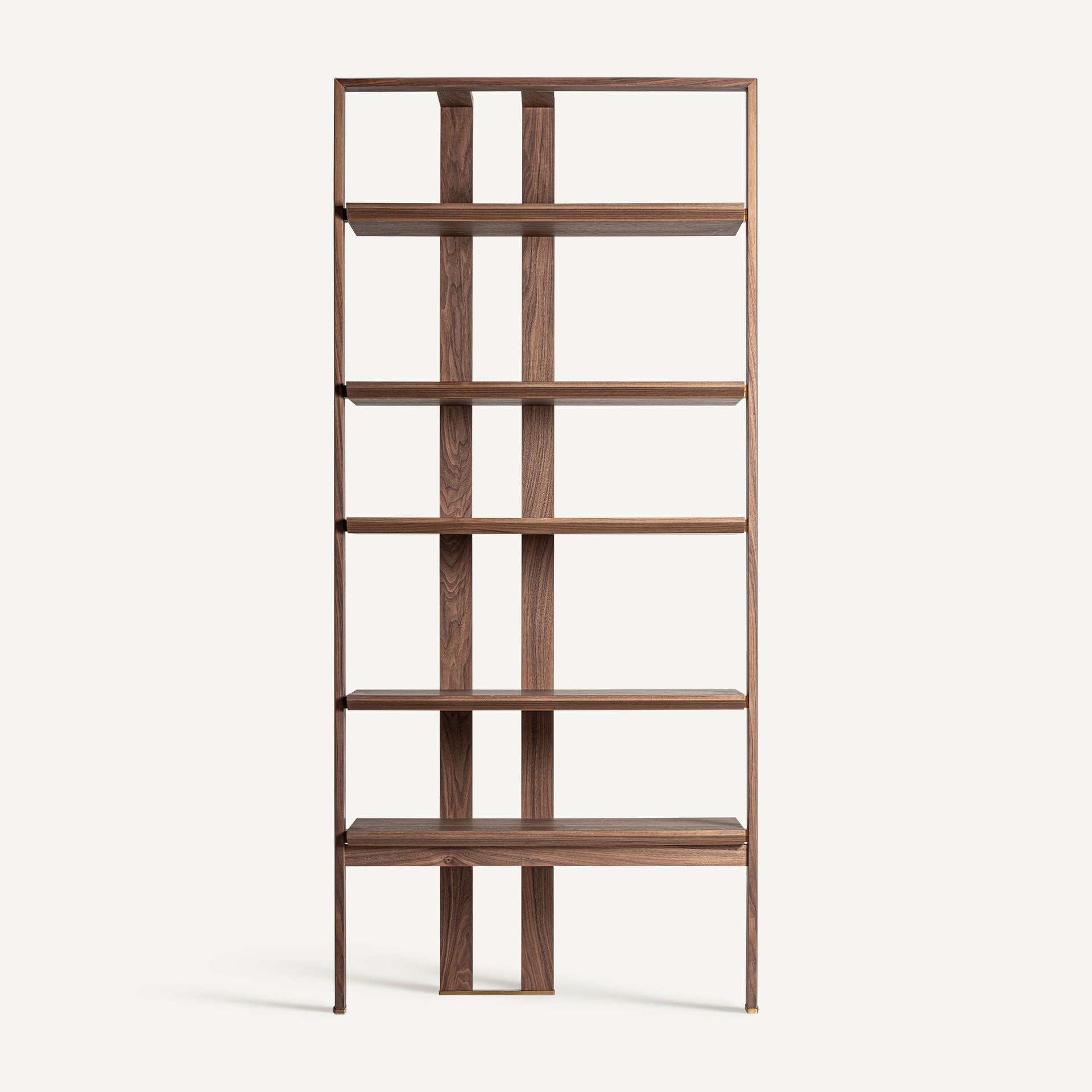 Contemporary style shelving unit, made of brown elm wood, combined with brown walnut veneer and MDF.