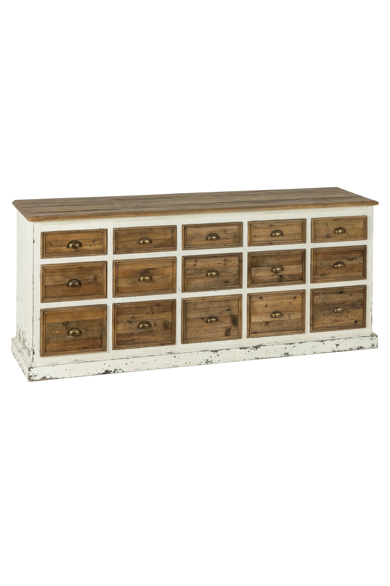 Chest of drawers made of natural-colored elm wood and black iron legs.