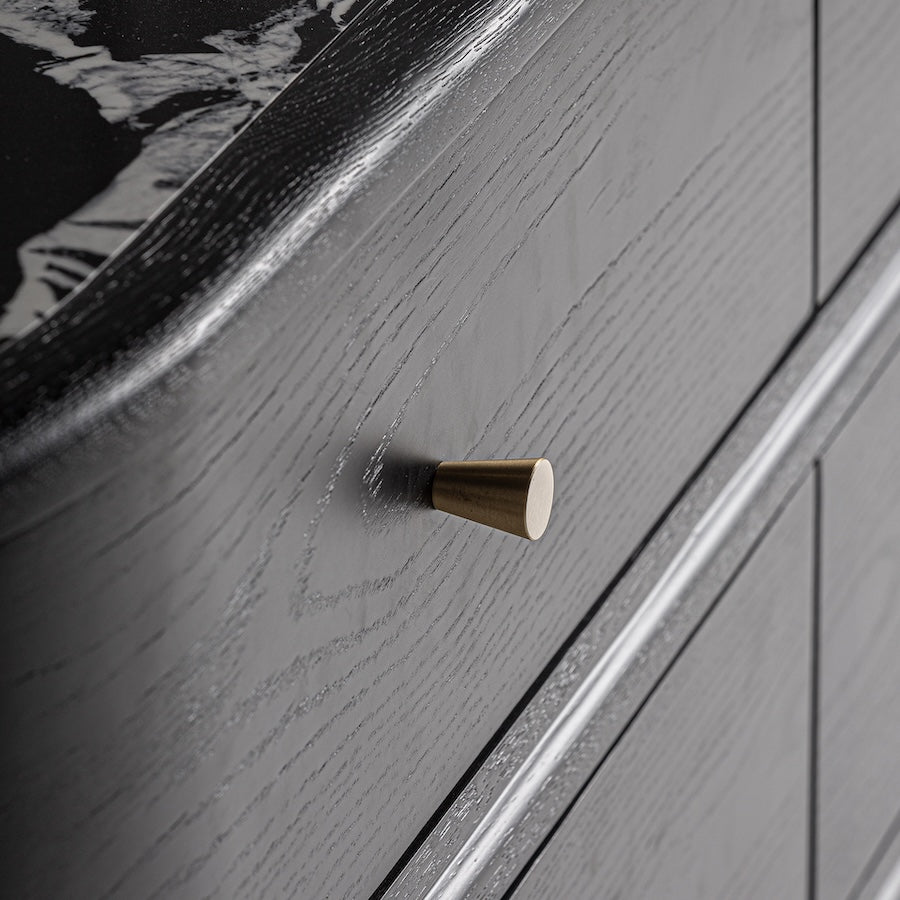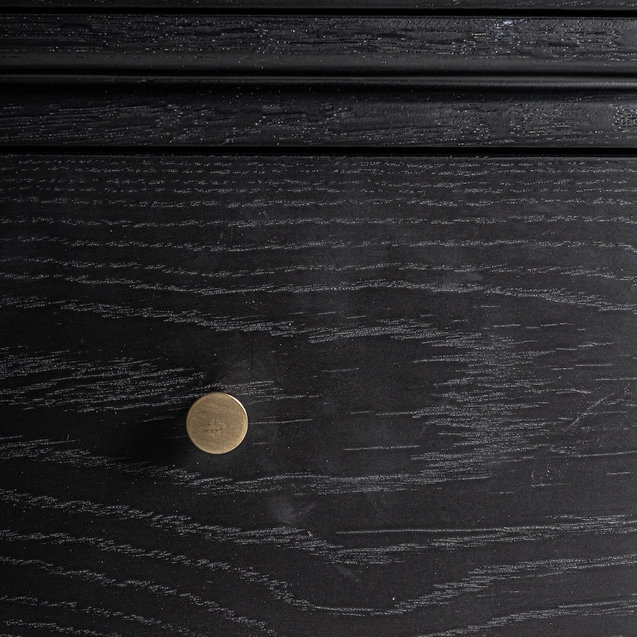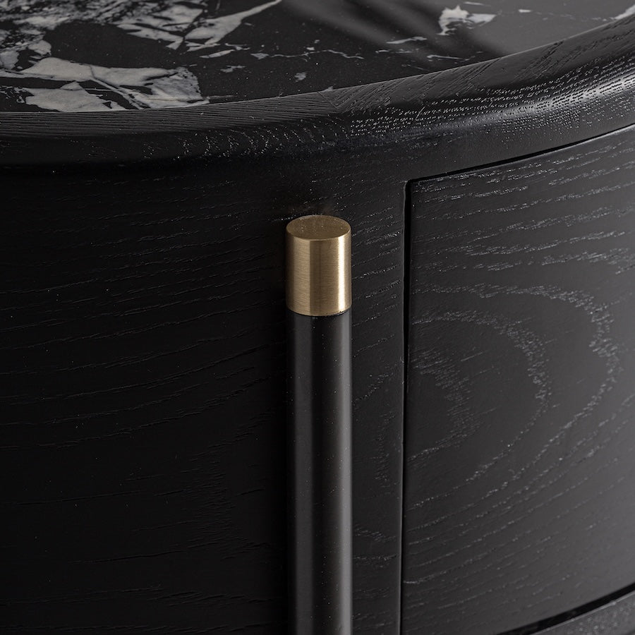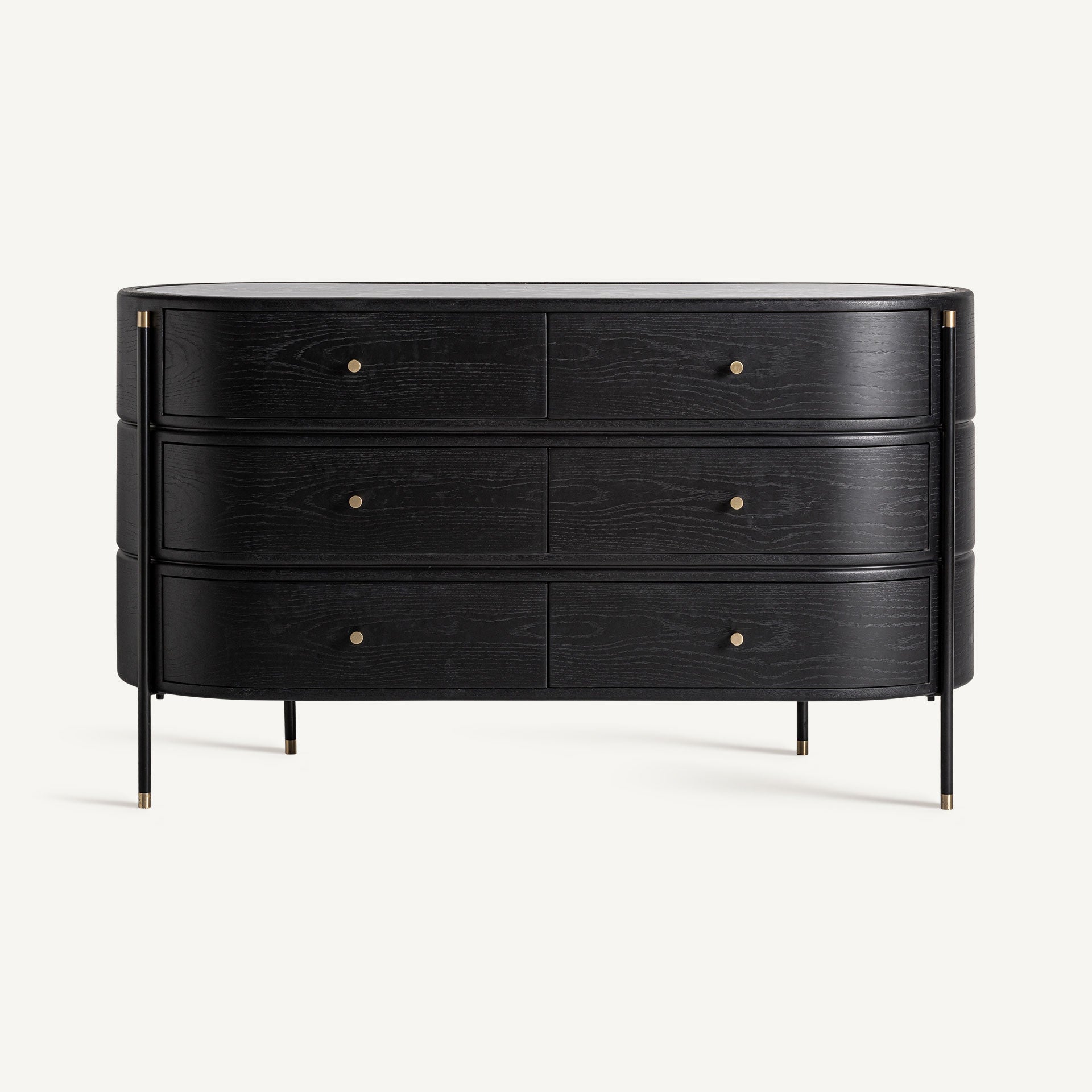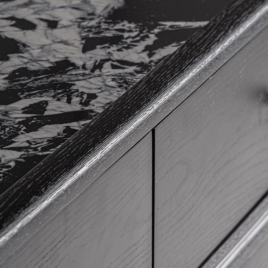 Contemporary style chest of drawers, made of black MDF wood, combined with black ceramic with a printed finish and black iron.