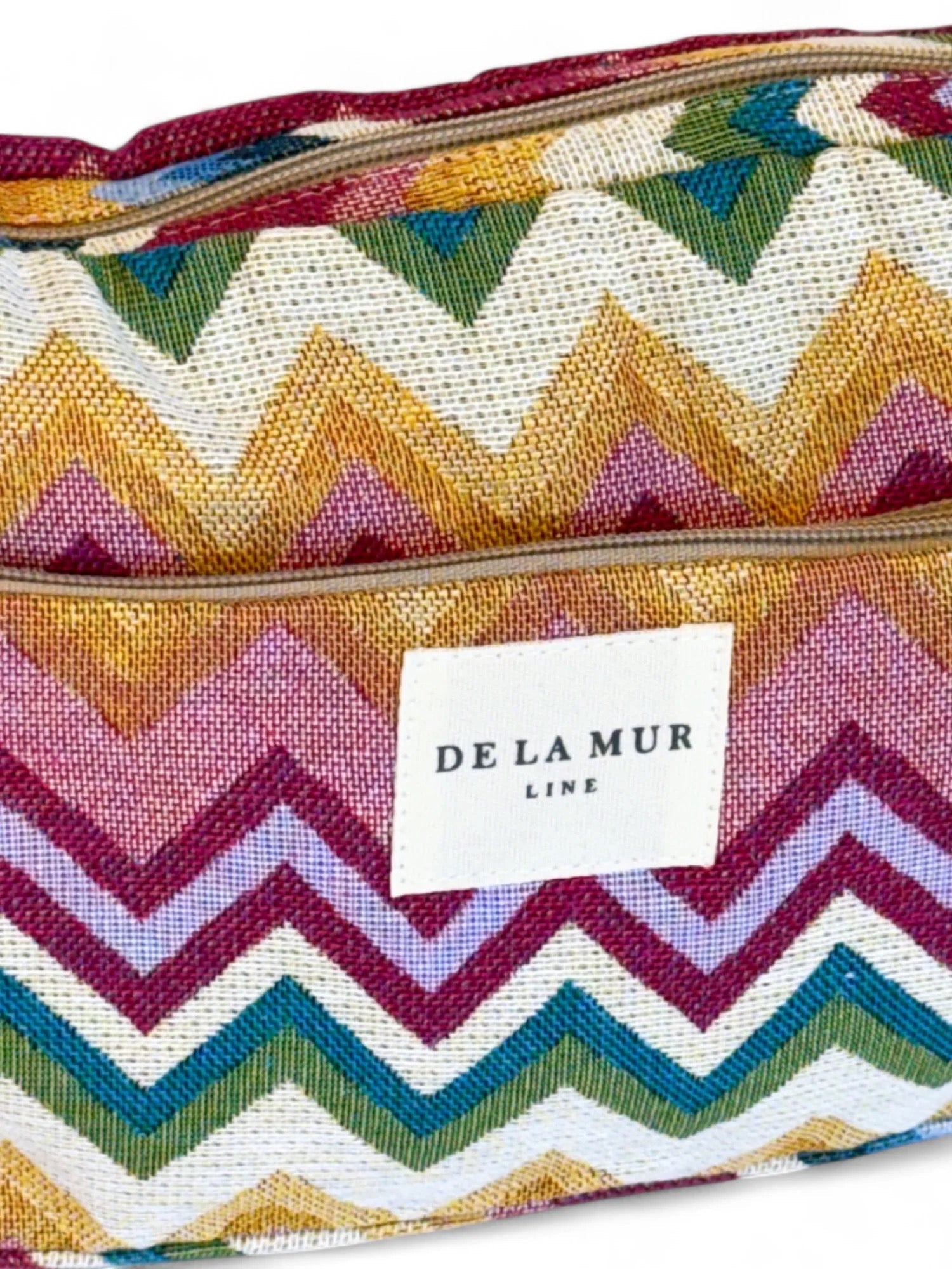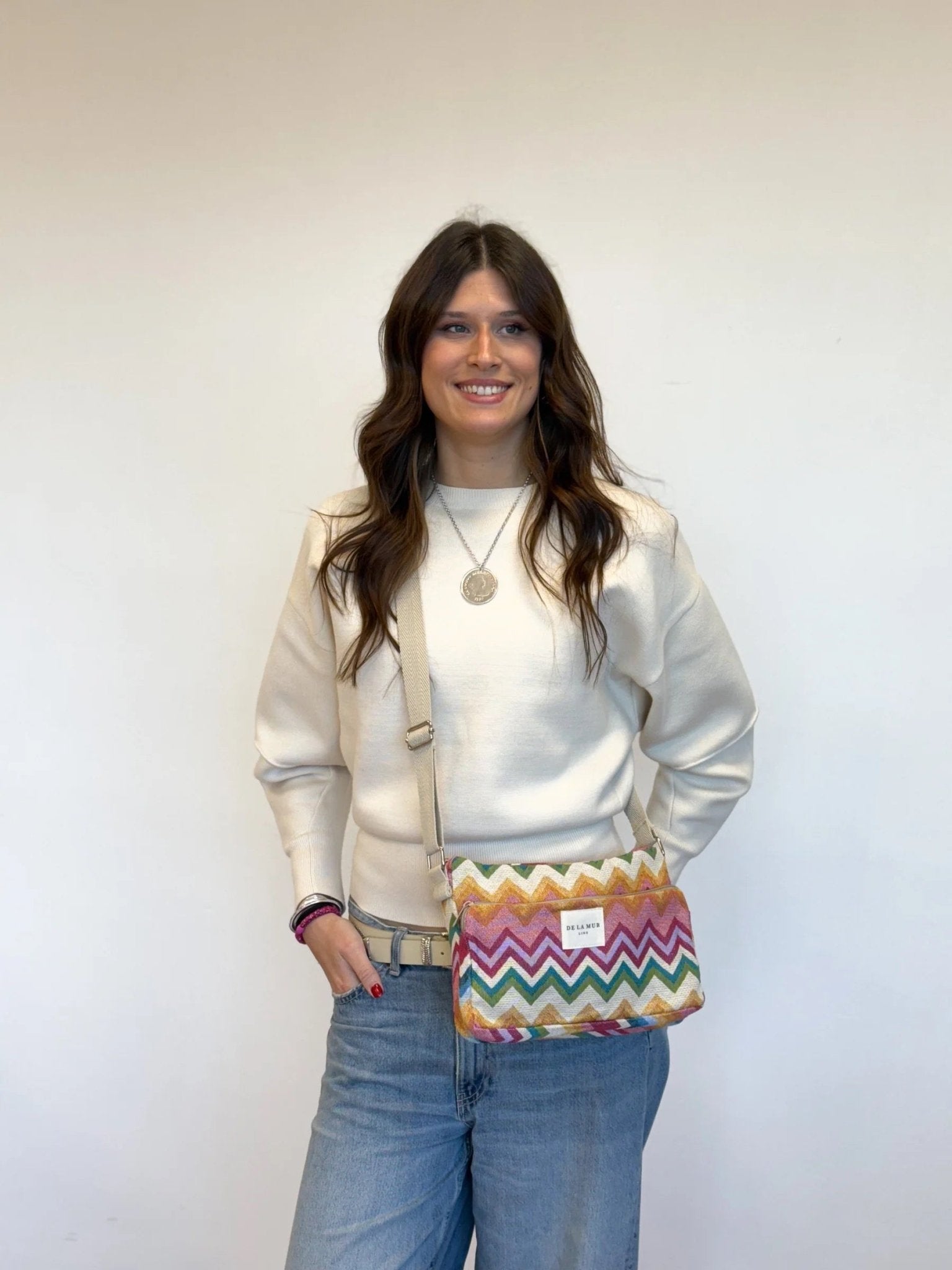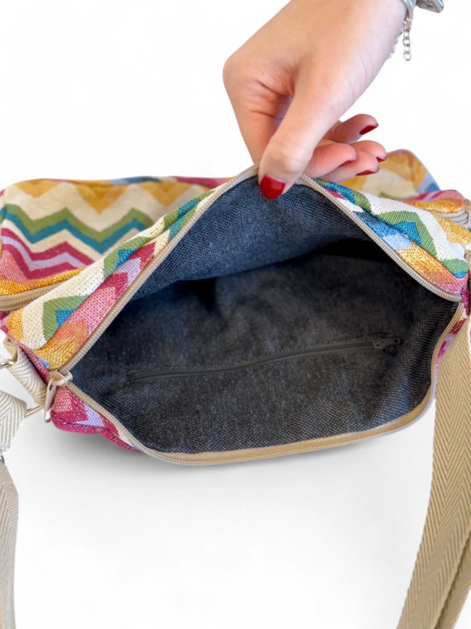 Medium crossbody bag with a long, adjustable and interchangeable beige cotton herringbone webbing strap. Featuring a thick jacquard fabric with a zigzag print in shades of pink and blue. Top closure and lower zippered pocket. Lined with thick gray fabric on the inside. Interior zippered pocket. For proper care, we recommend hand washing in cold water and using a dryer.
