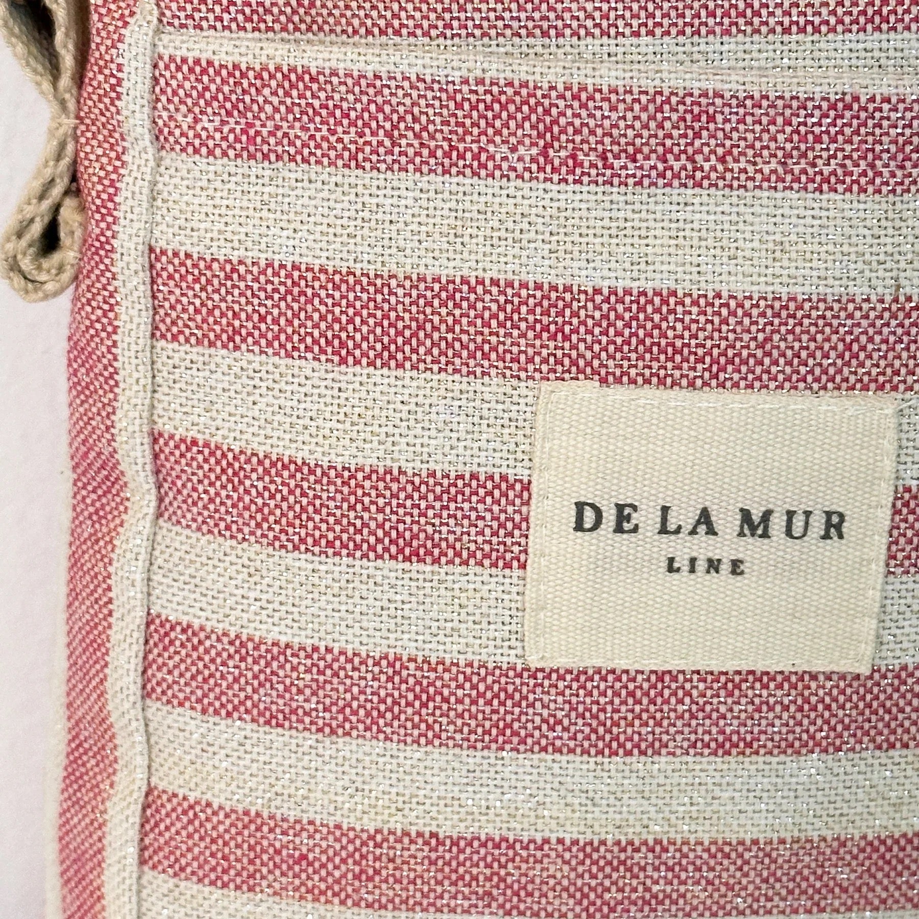A crossbody phone bag with a top zipper and a long, adjustable strap made of beige cotton herringbone webbing. There's a zipperless pocket on the outside. Made with a fine half-panama fabric with a pink and ecru striped print and shiny gold and silver lurex. Lined with a thick gray fabric on the inside. For proper care, we recommend hand washing in cold water and not using a dryer. Ideal for carrying your phone, keys, and wallet when going for a walk. For when you want to unwind and take as little as possible with you.