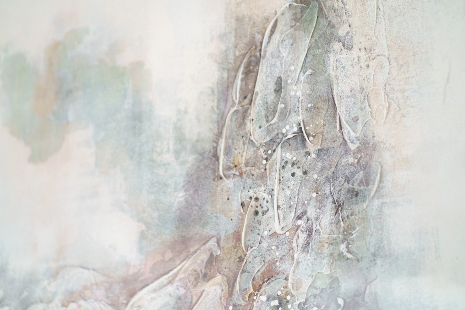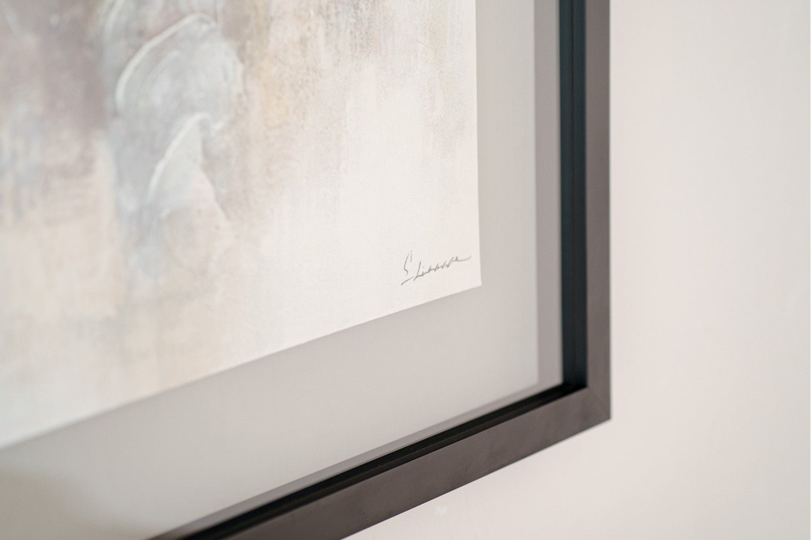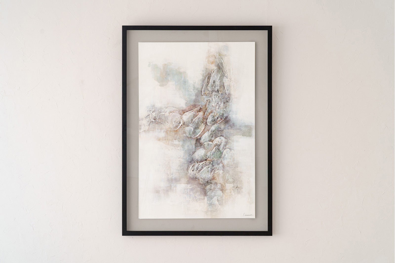 Abstract painting made by hand on canvas with the motif of a cliff with a frame in a natural wood finish.