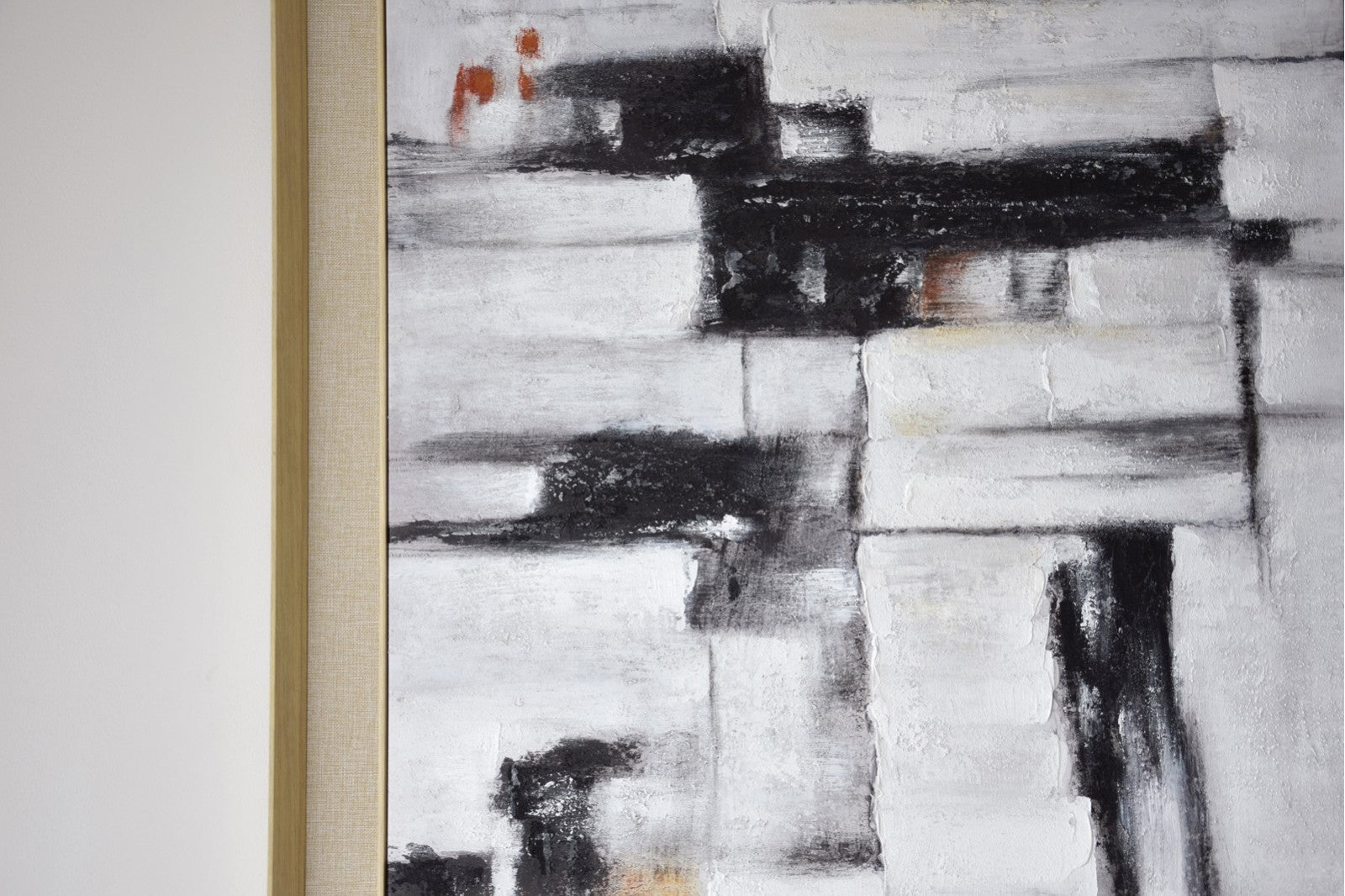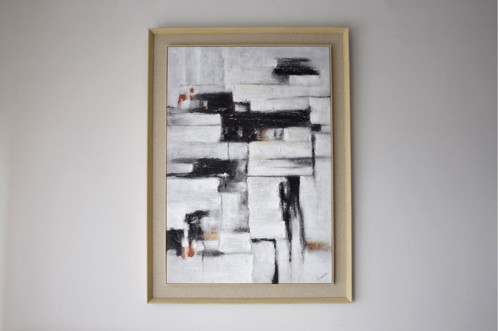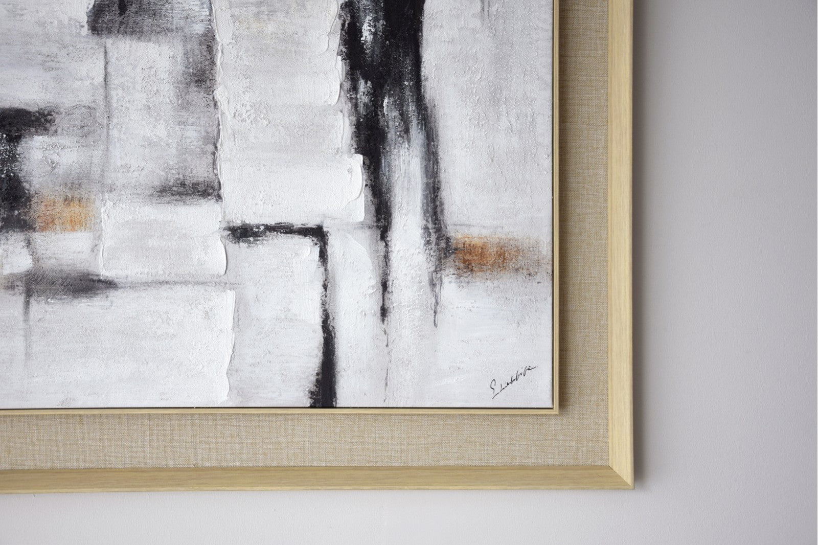 Abstract acrylic painting on canvas, hand painted. Painting with different thick textures in white, black tones and two light brush strokes in ochre. Framed with a double frame in a natural wood finish and a linen strip between them.