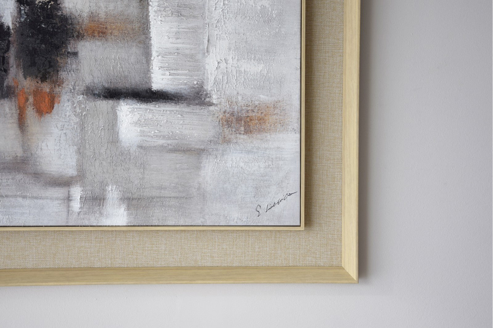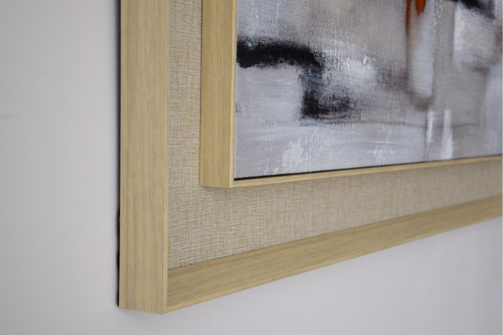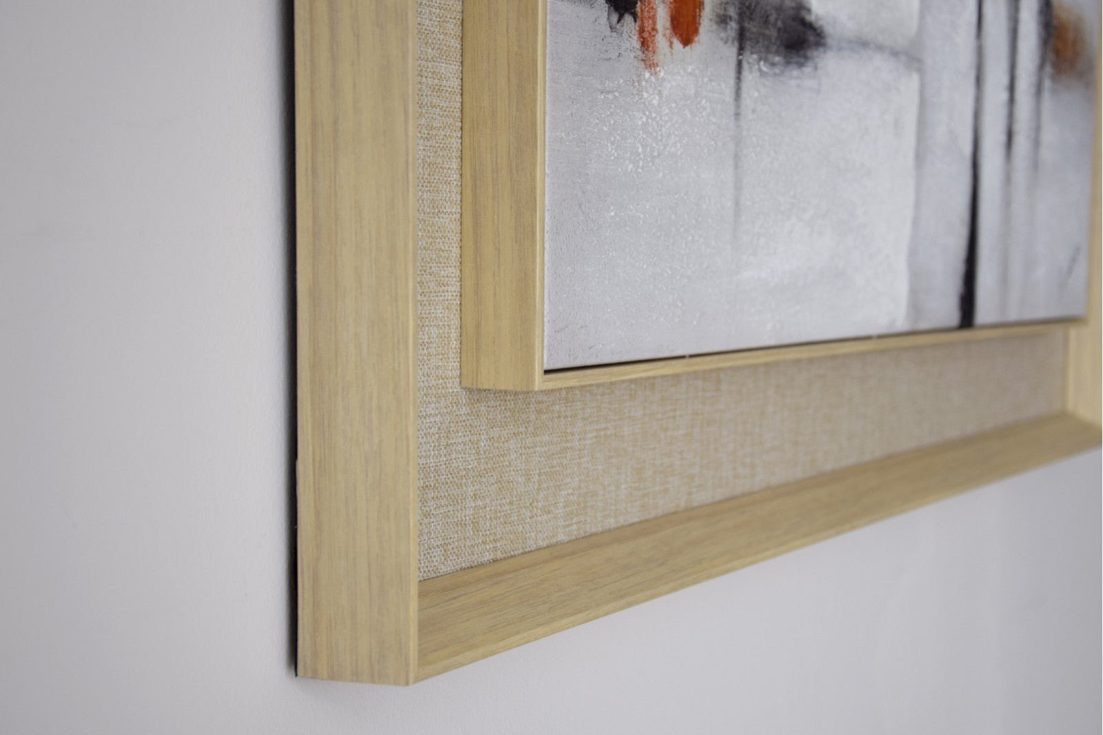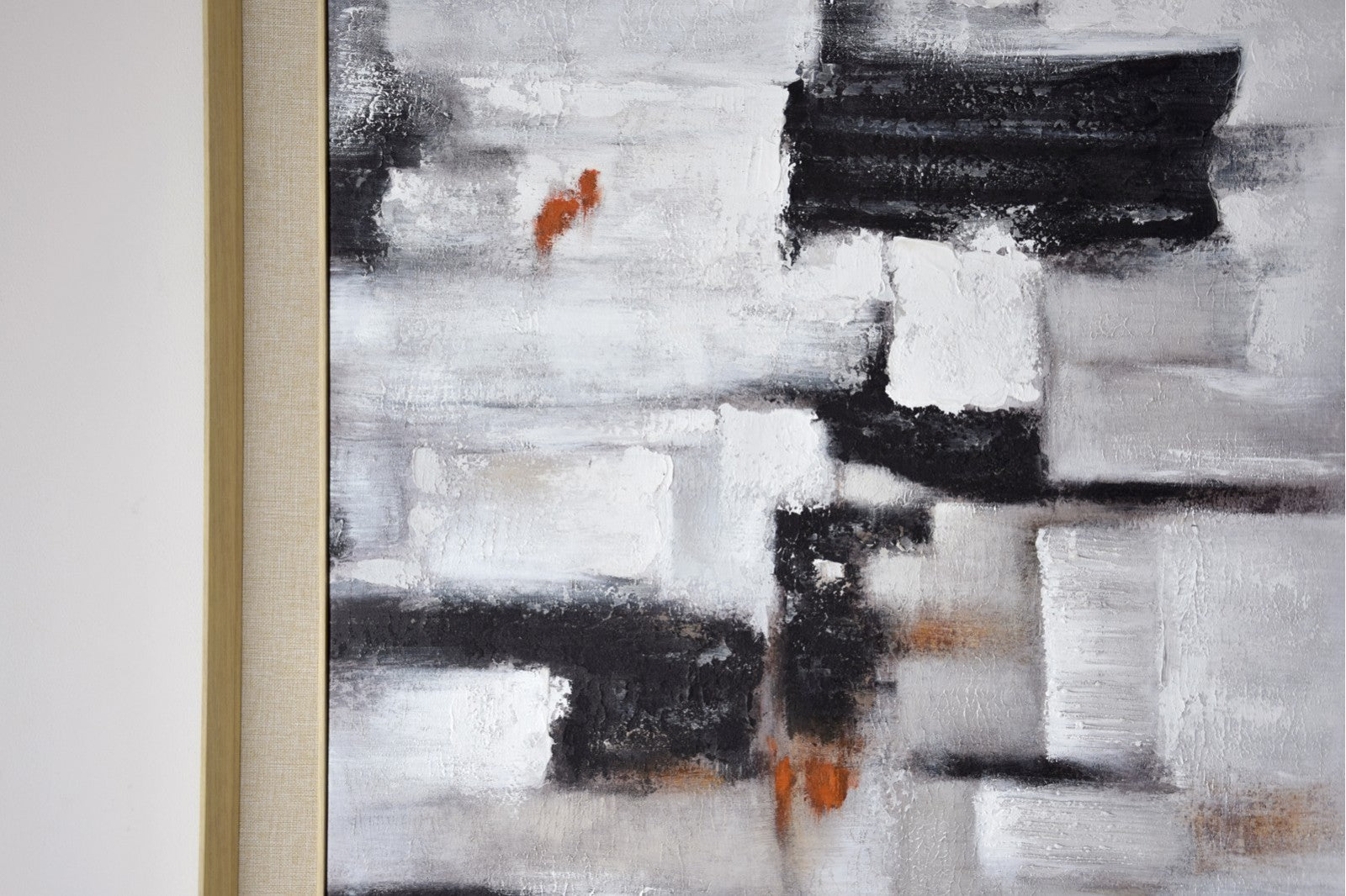 Abstract acrylic painting on canvas, hand painted. Painting with different thick textures in white, black tones and two light brush strokes in ochre. Framed with a double frame in a natural wood finish and a linen strip between them.