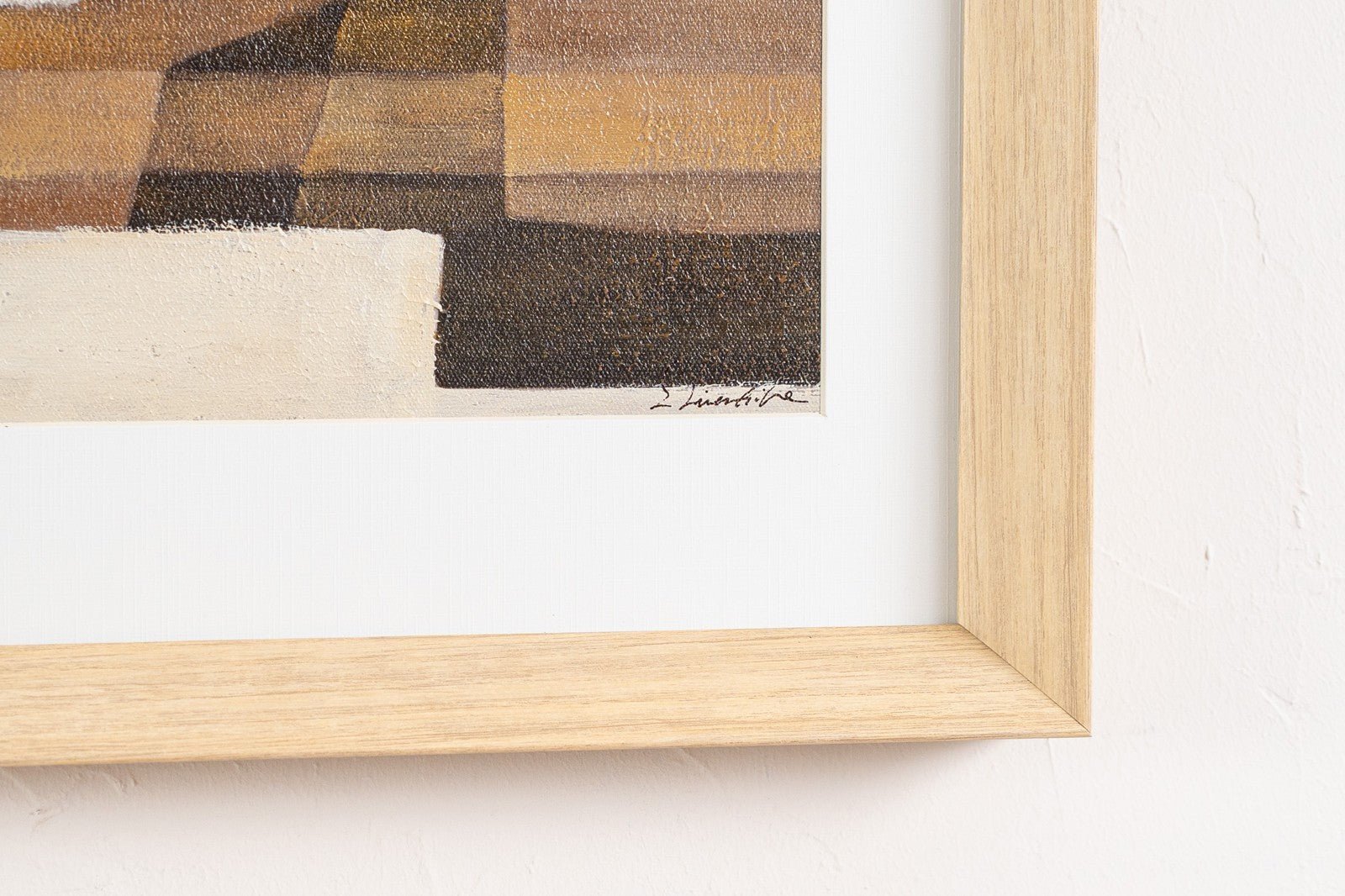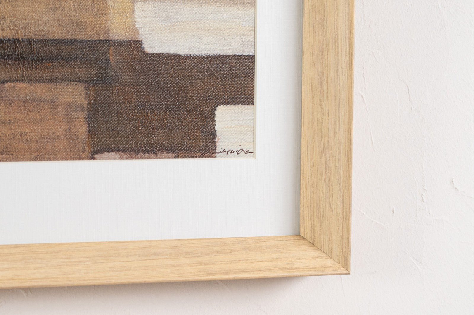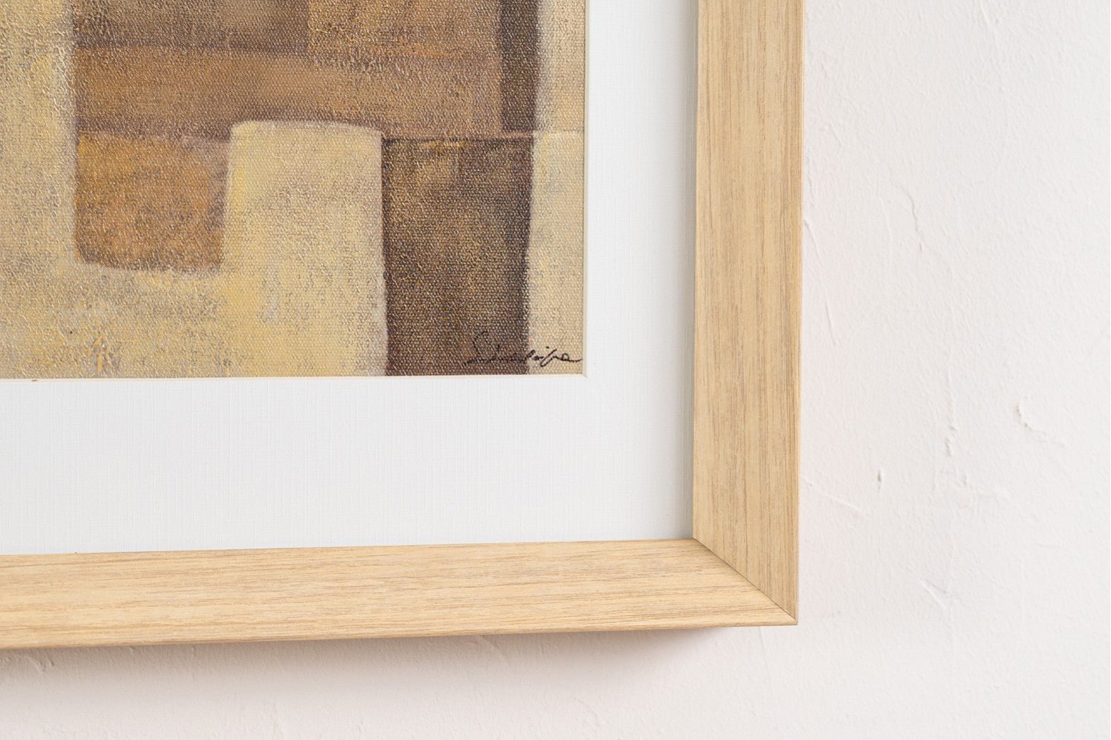 Abstract painting done by hand on canvas with motifs in ochre and tan tones on a white background and framed with glass and a natural wood frame.