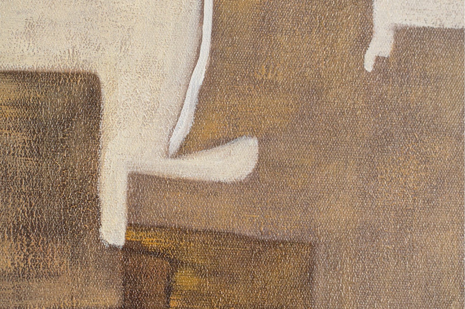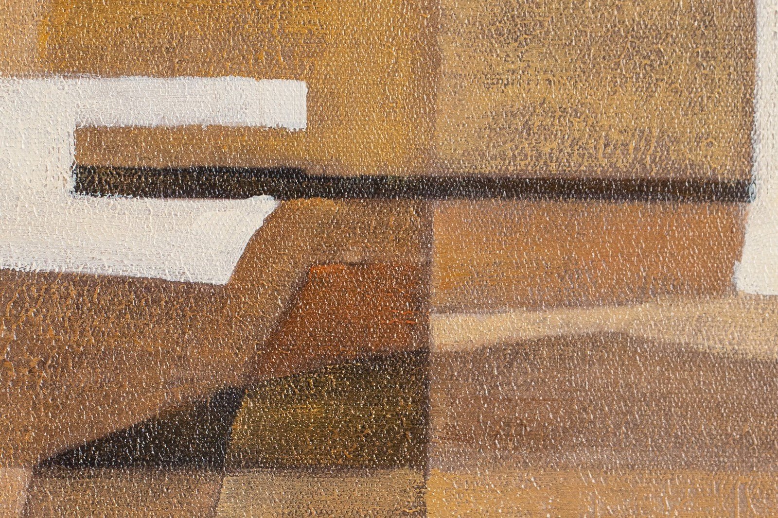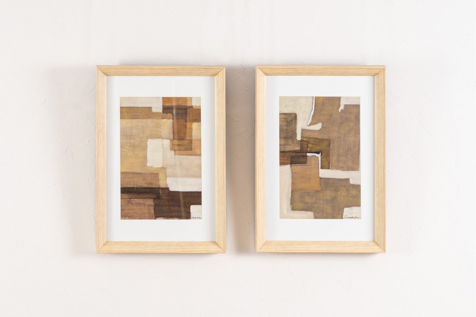 Abstract painting done by hand on canvas with motifs in ochre and tan tones on a white background and framed with glass and a natural wood frame.