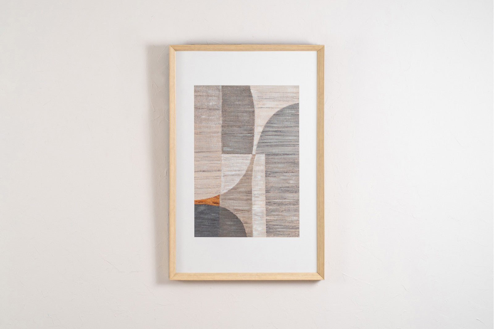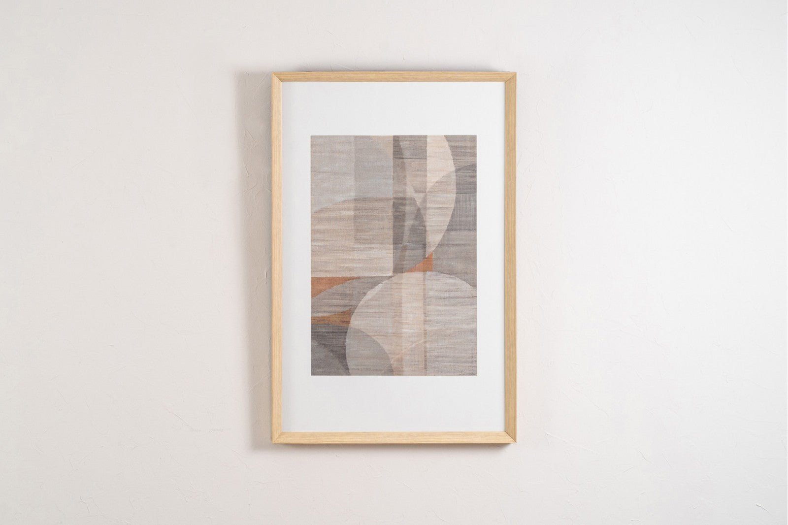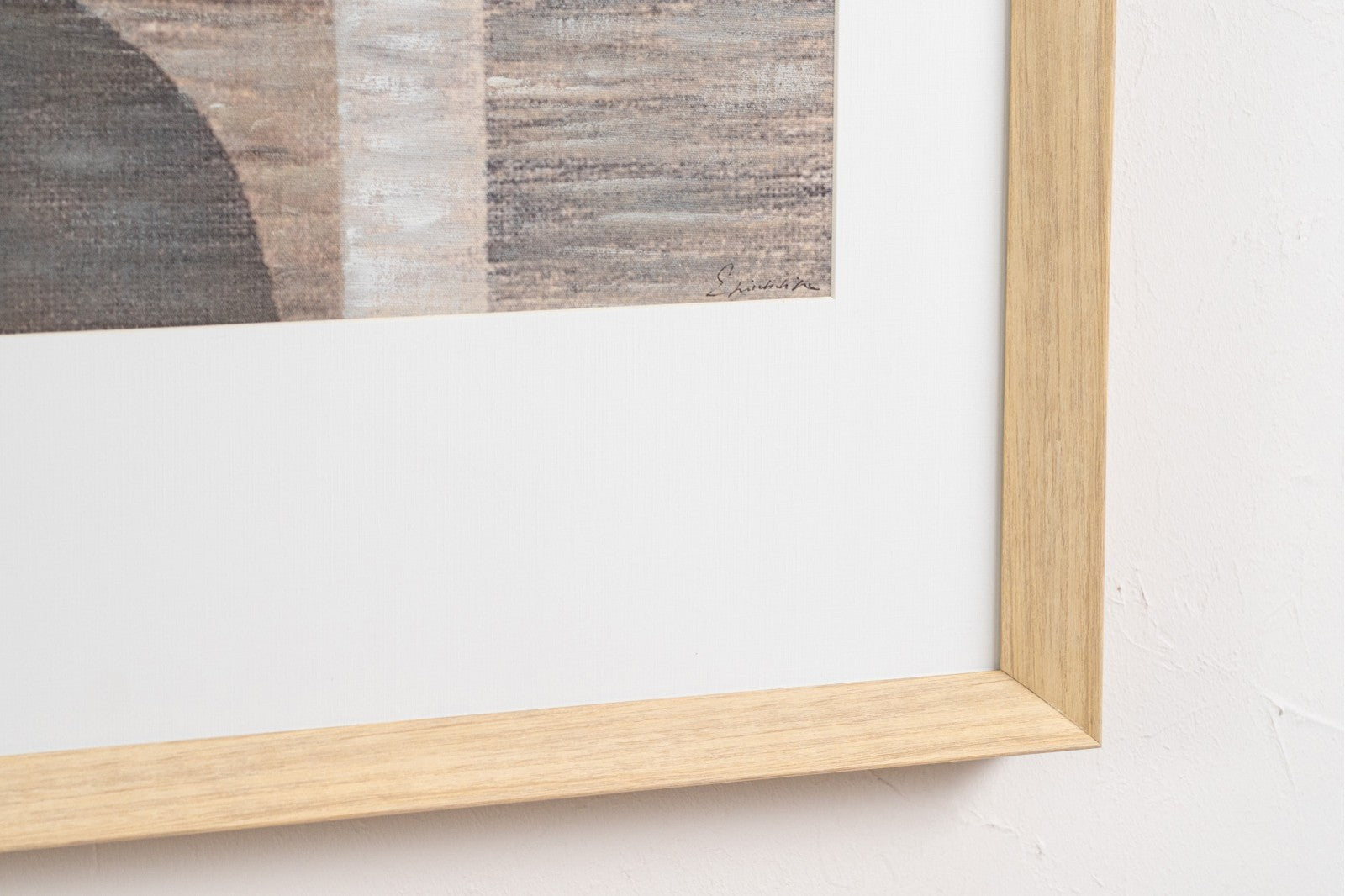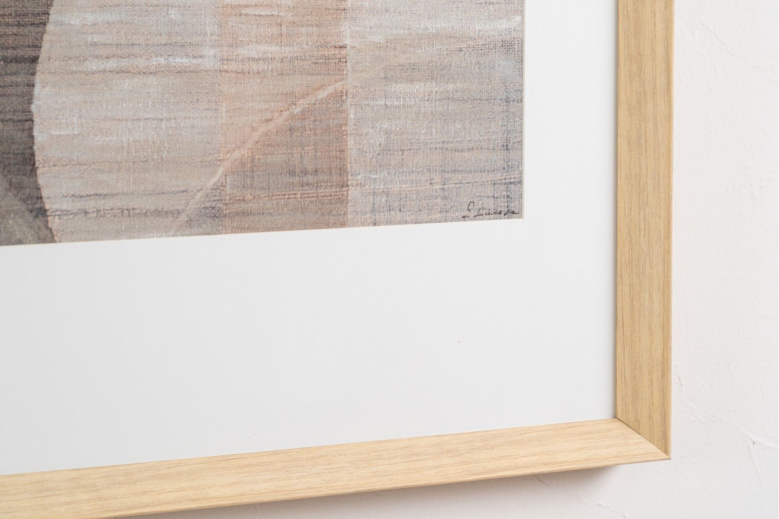 Hand-painted abstract painting on canvas in shades of sand, brown, white, gray, and a touch of dark orange, framed in glass with a natural wood frame.