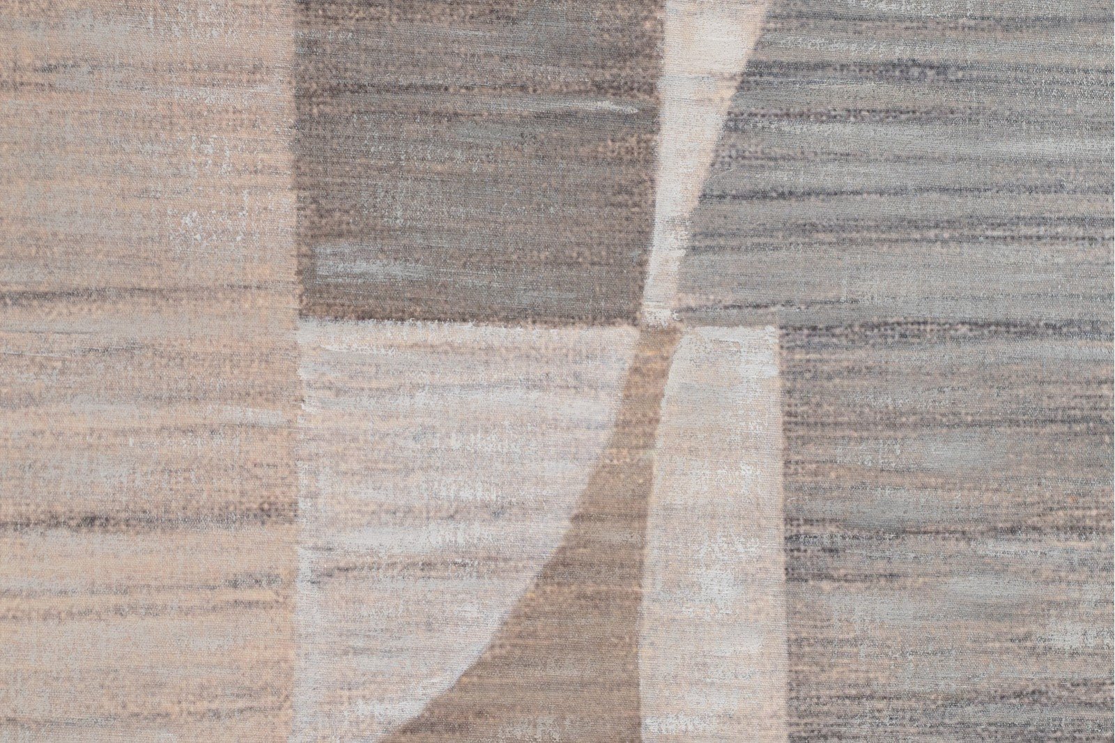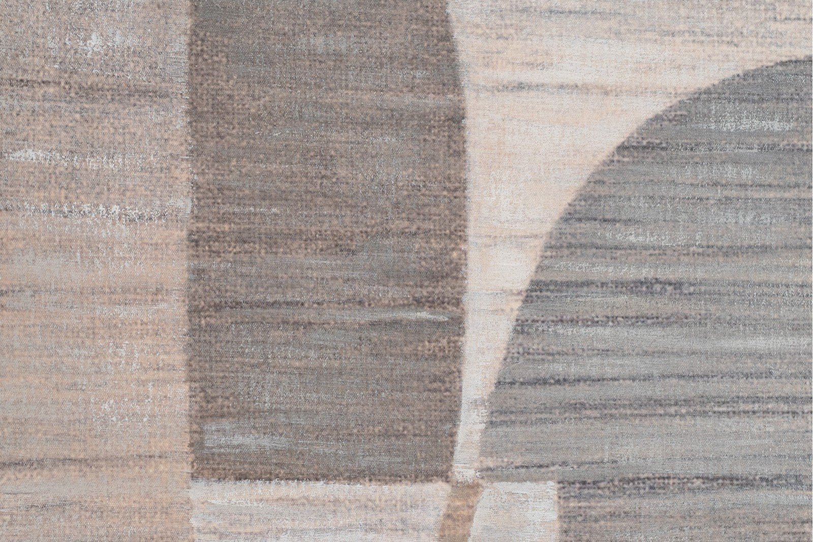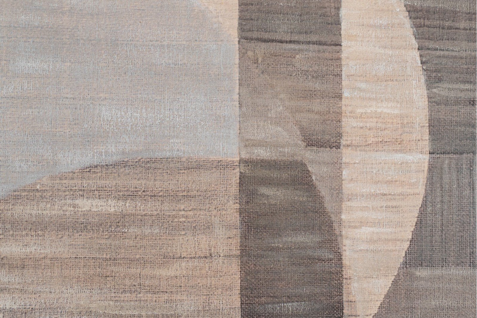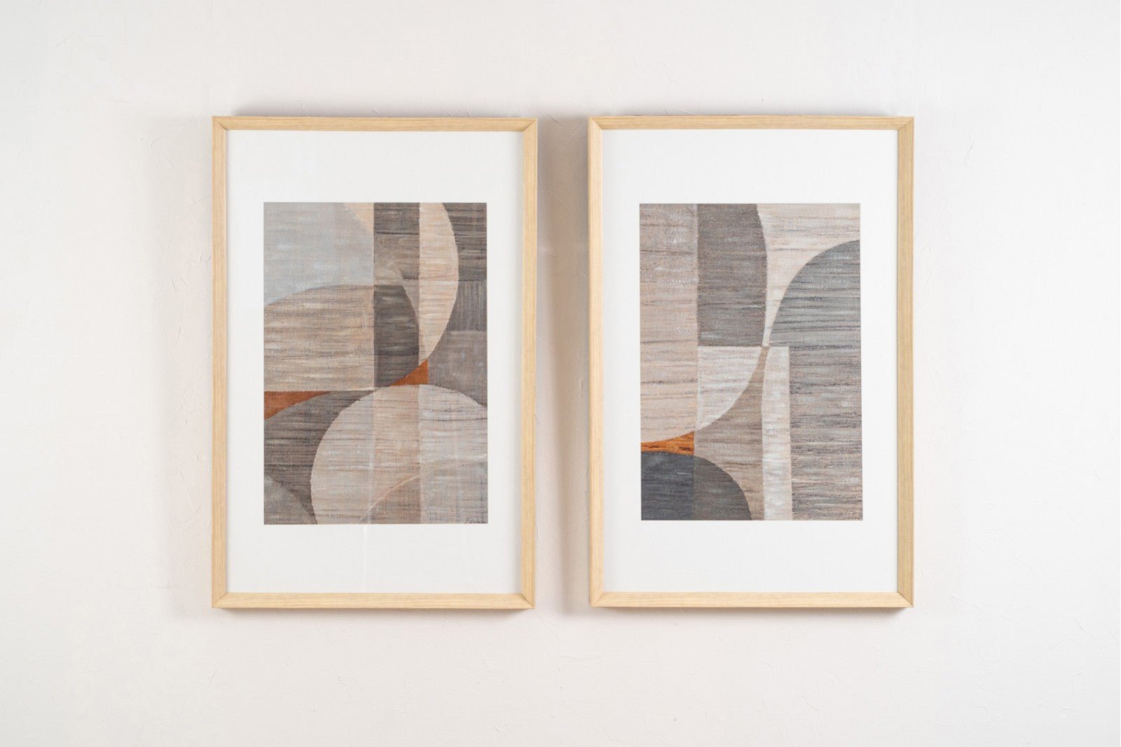 Hand-painted abstract painting on canvas in shades of sand, brown, white, gray, and a touch of dark orange, framed in glass with a natural wood frame.