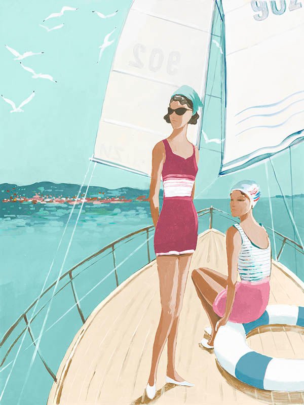 Our painting "Women on a Sailboat" is printed on canvas and then hand-painted before being stretched over a wooden frame. Original and colorful, it will add a personal and unique touch to any space.