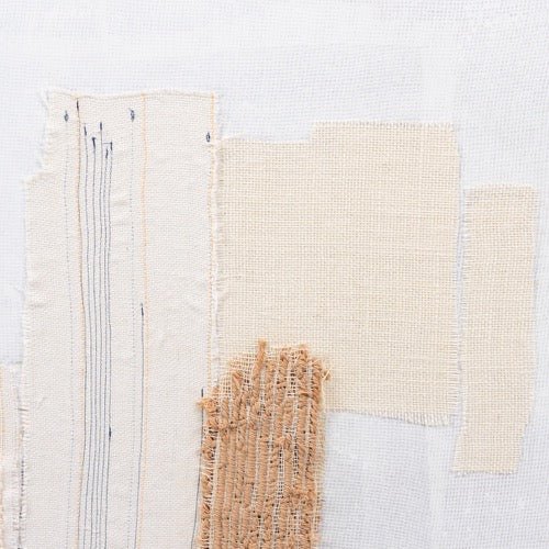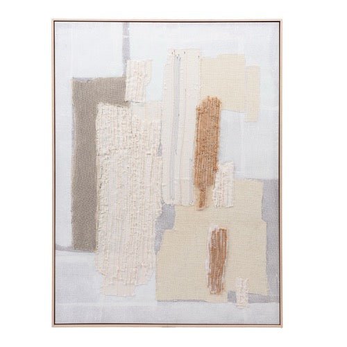 An abstract painting made of canvas stretched over a pine wood frame, which lends warmth and naturalness to the piece. Light colors predominate, such as whites, creams, and soft pastel tones, intertwining in organic, fluid shapes, evoking feelings of calm and serenity. The texture of the canvas combined with the pine structure enhances the simplicity and elegance of the design, inviting the viewer to a relaxing and harmonious visual experience.