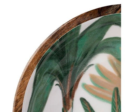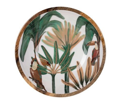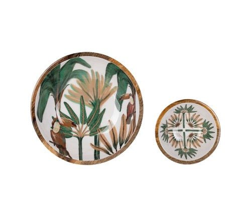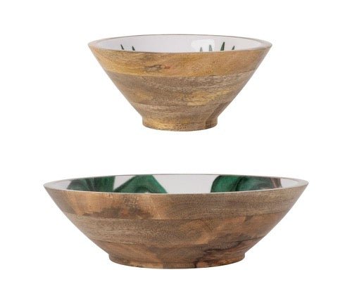 Bowl with leaf patterns made of natural and multicoloured wood. Available in two different sizes.
