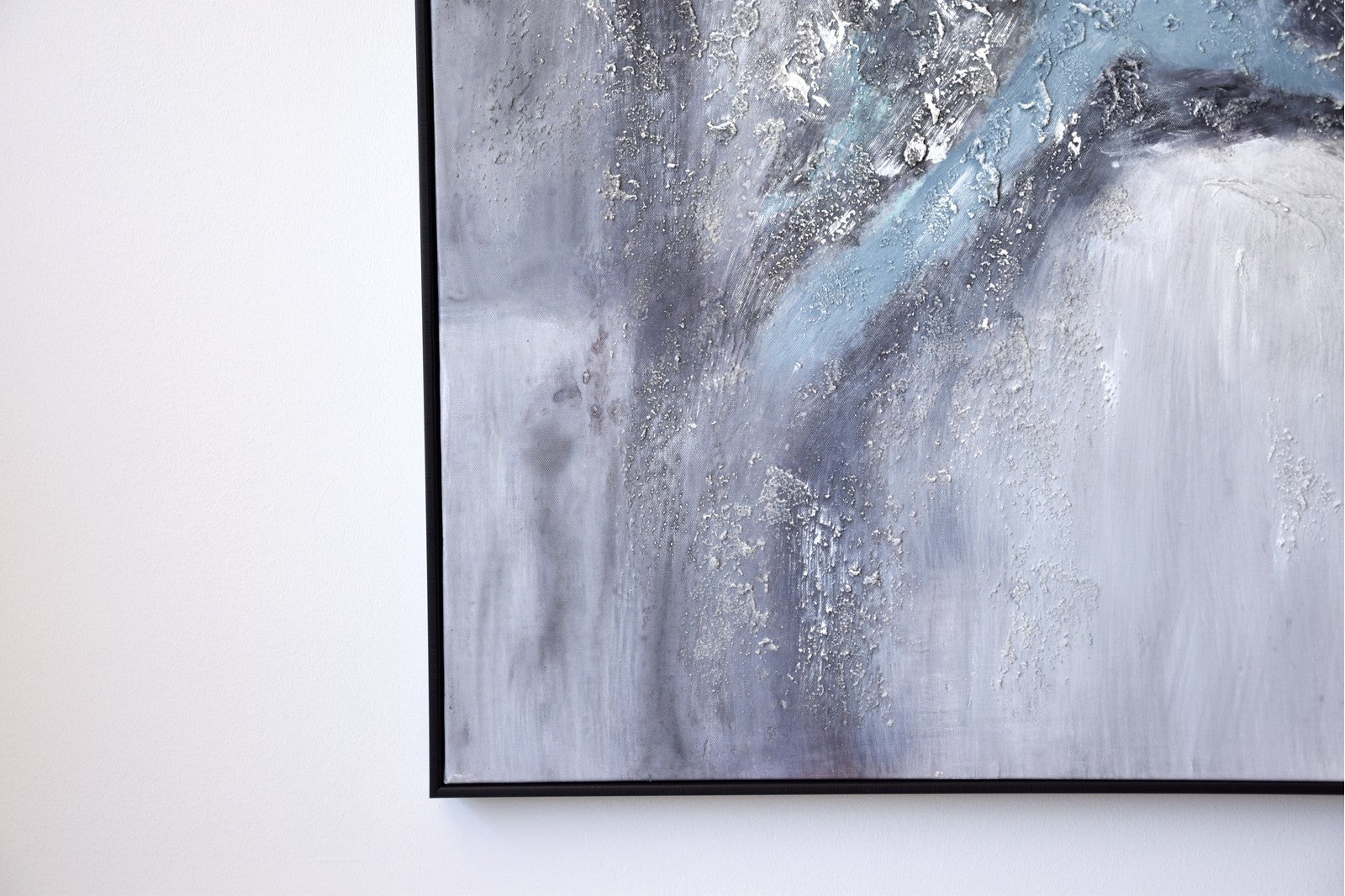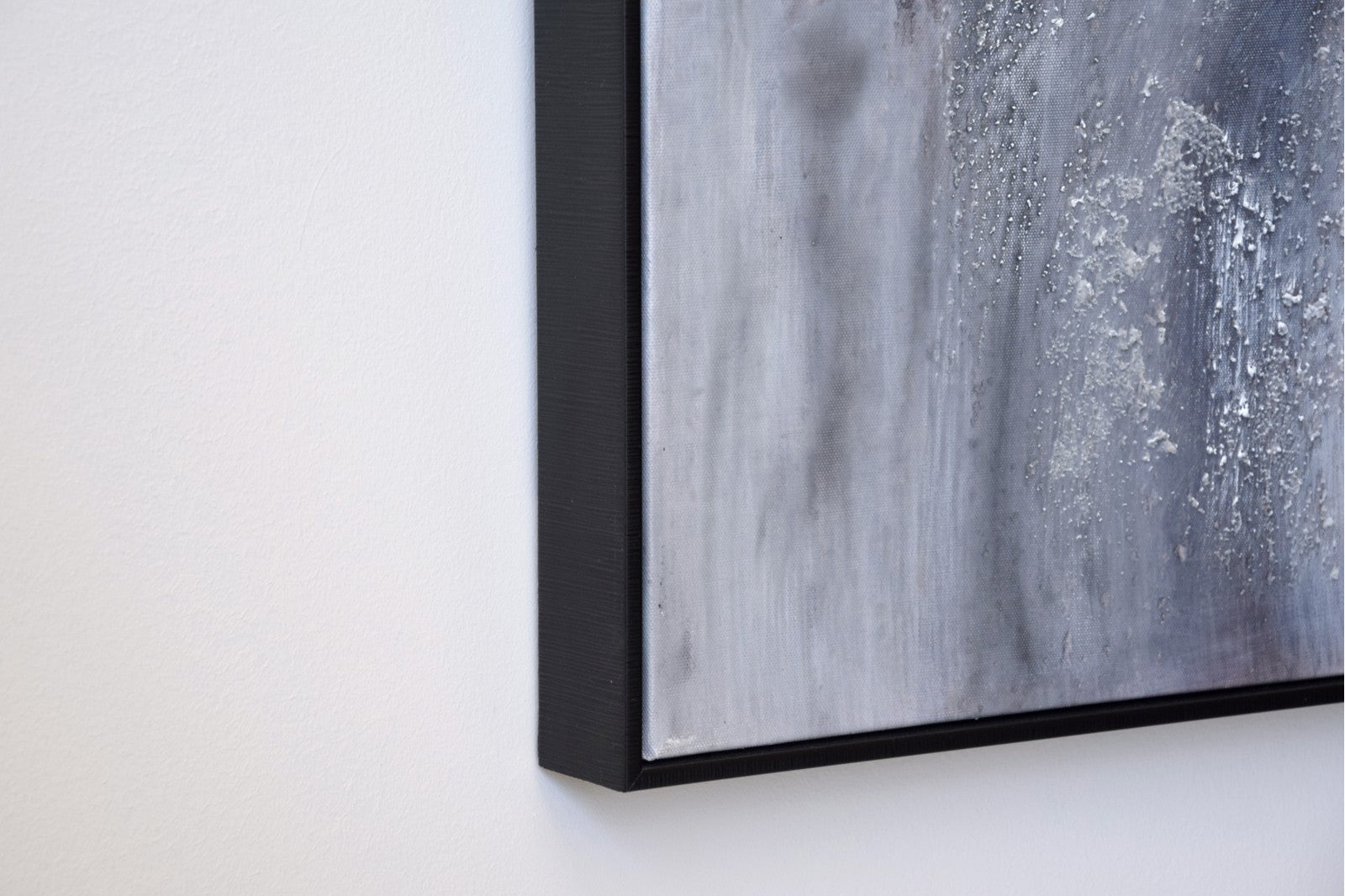 Abstract painting handmade on canvas in white, green, orange and black tones with a black frame.