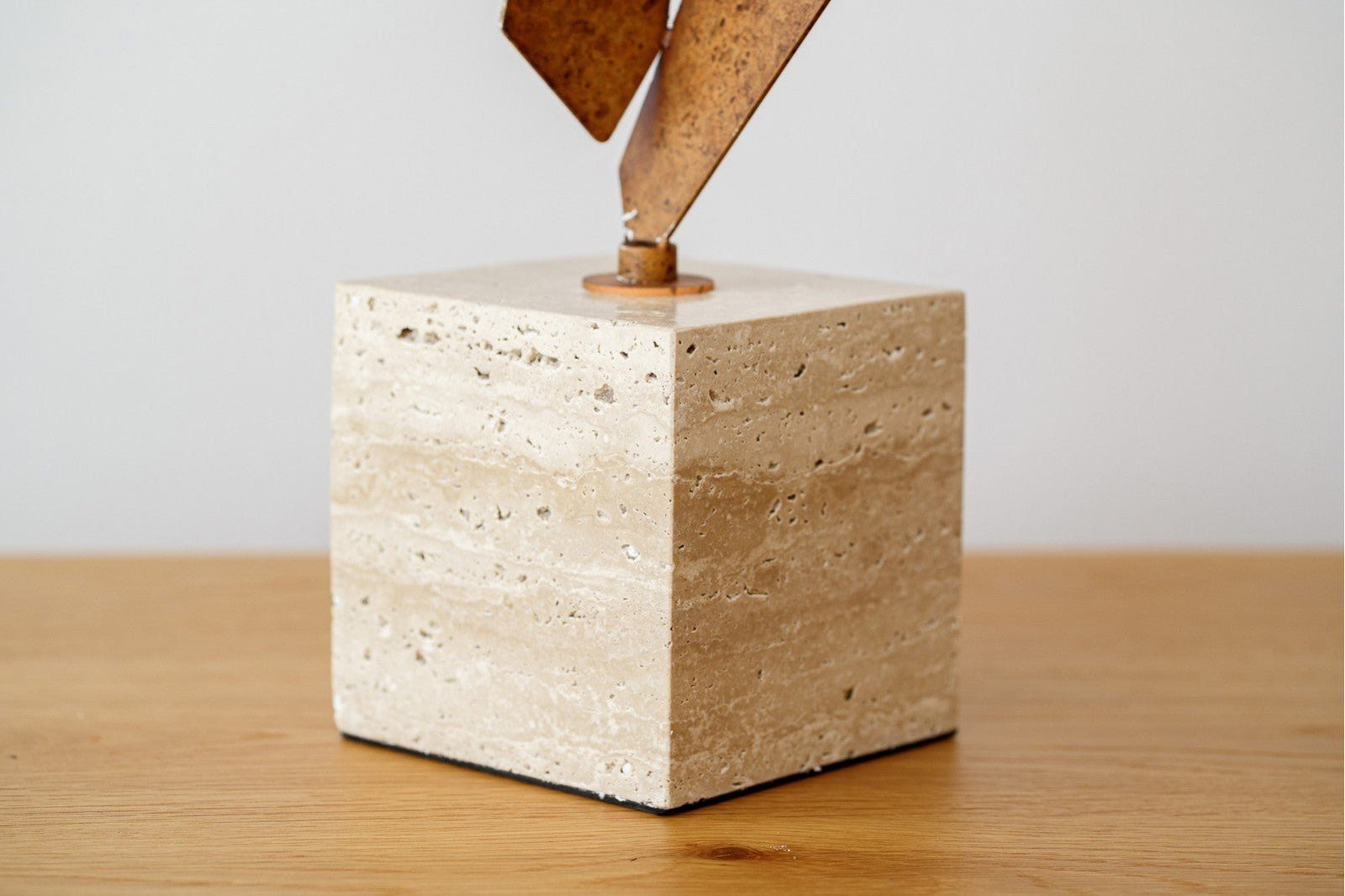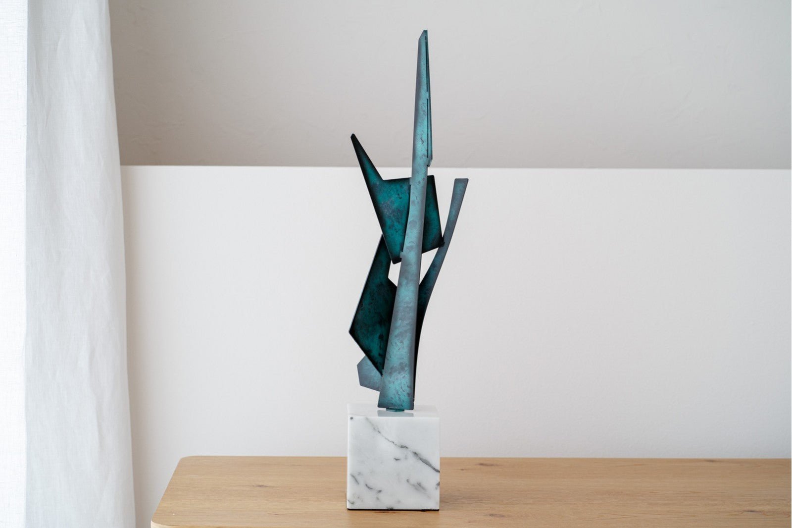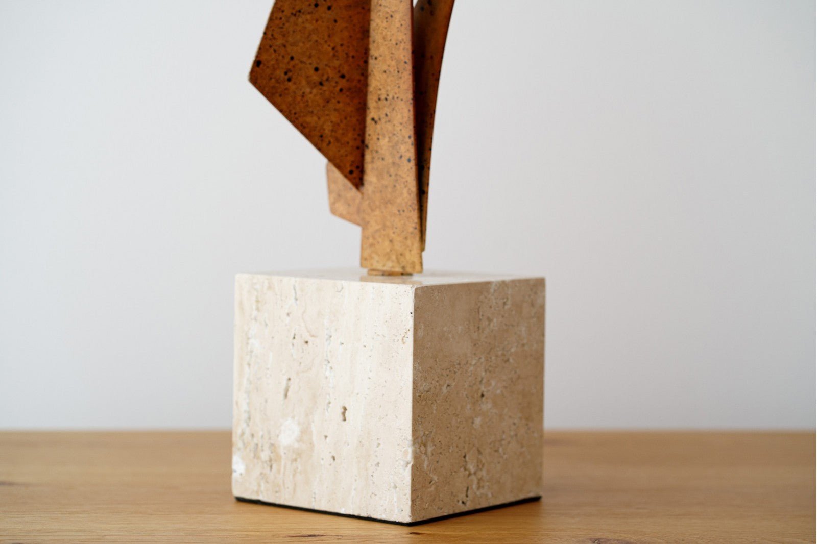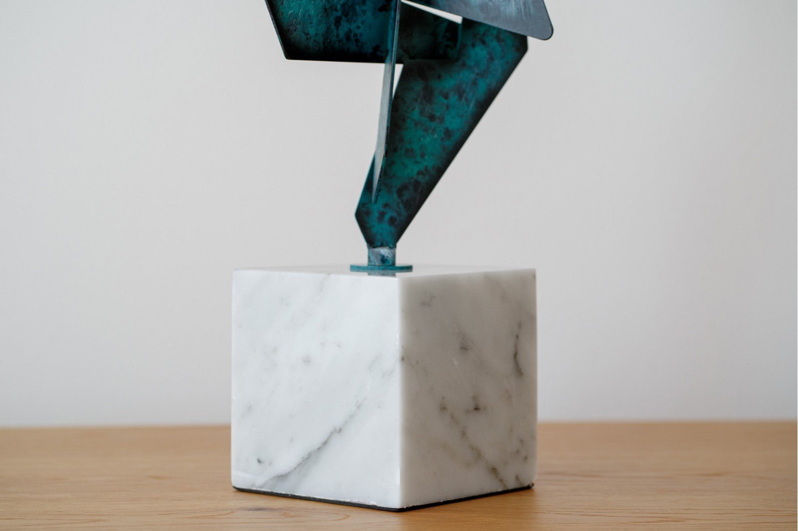 An abstract metal sculpture in shades of green/blue and oxide with an irregularly applied finish. The base is a cubic shape made of natural white marble veined in gray and natural travertine marble. Since these are natural stones and handcrafted finishes, there may be variations from piece to piece.