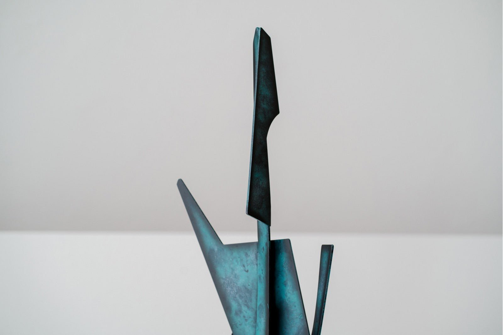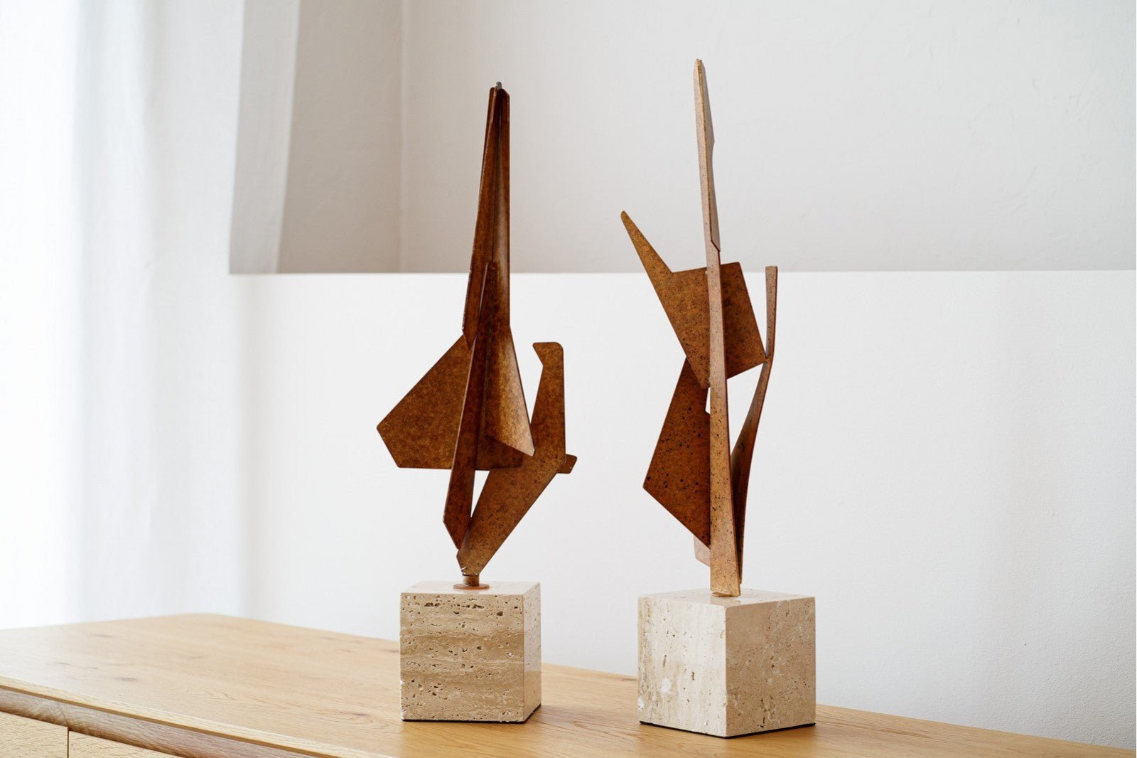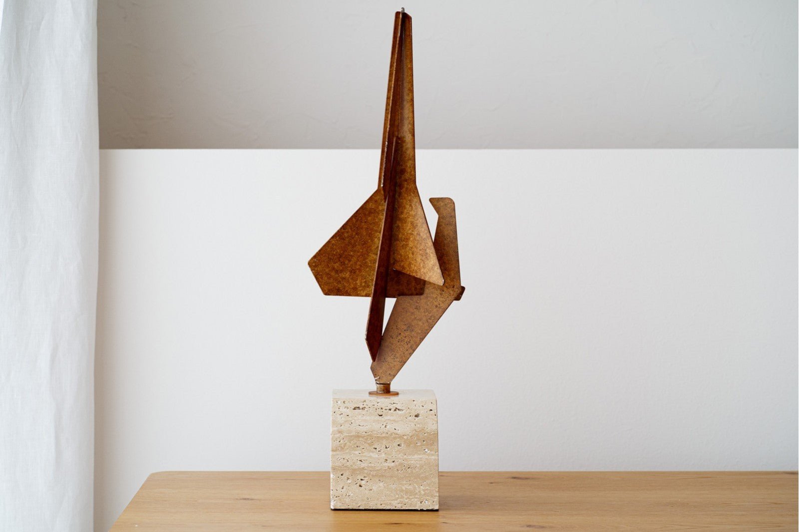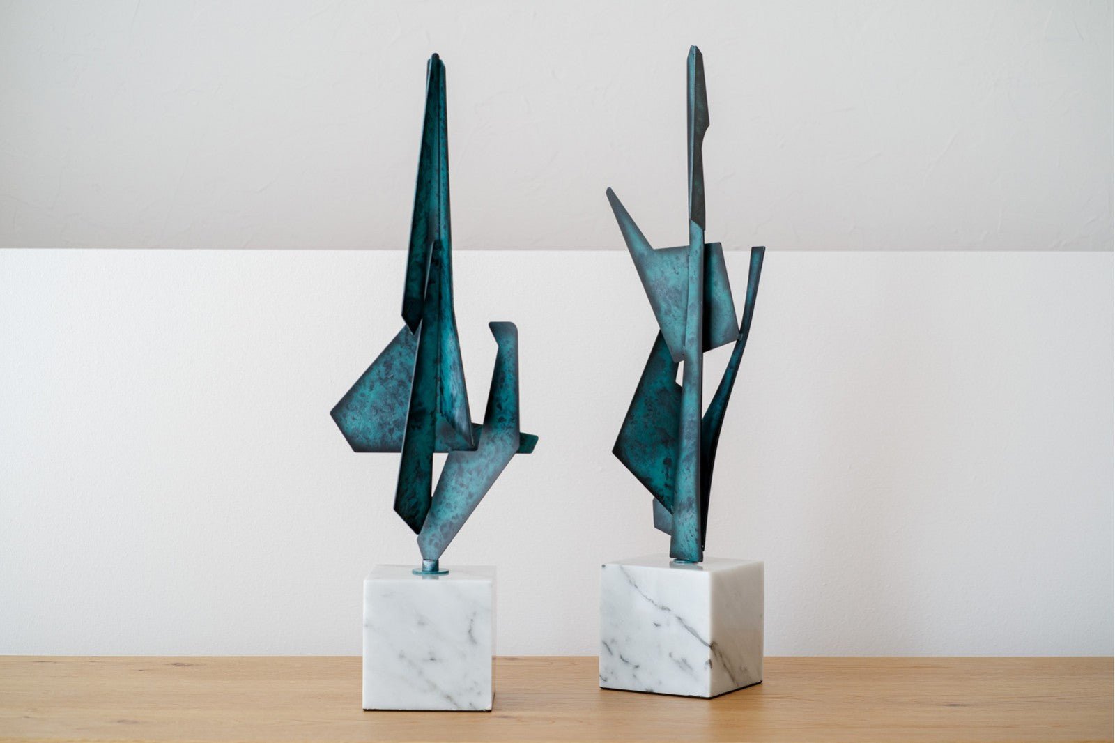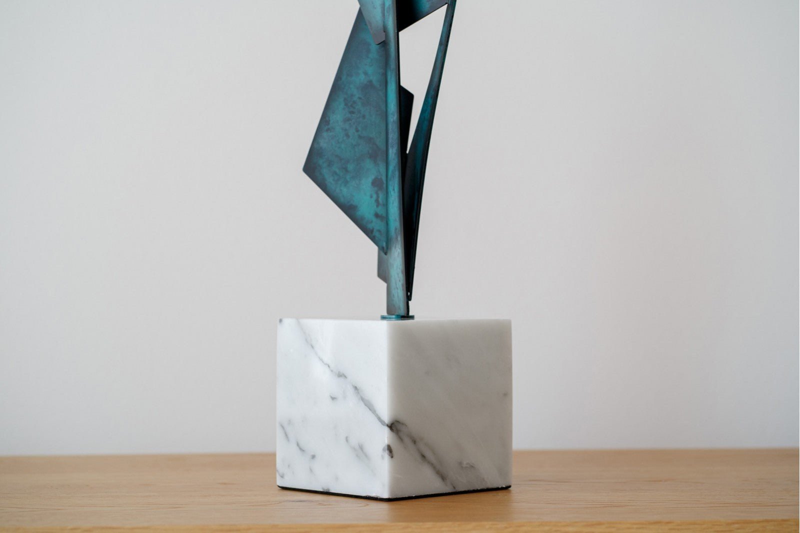 An abstract metal sculpture in shades of green/blue and oxide with an irregularly applied finish. The base is a cubic shape made of natural white marble veined in gray and natural travertine marble. Since these are natural stones and handcrafted finishes, there may be variations from piece to piece.
