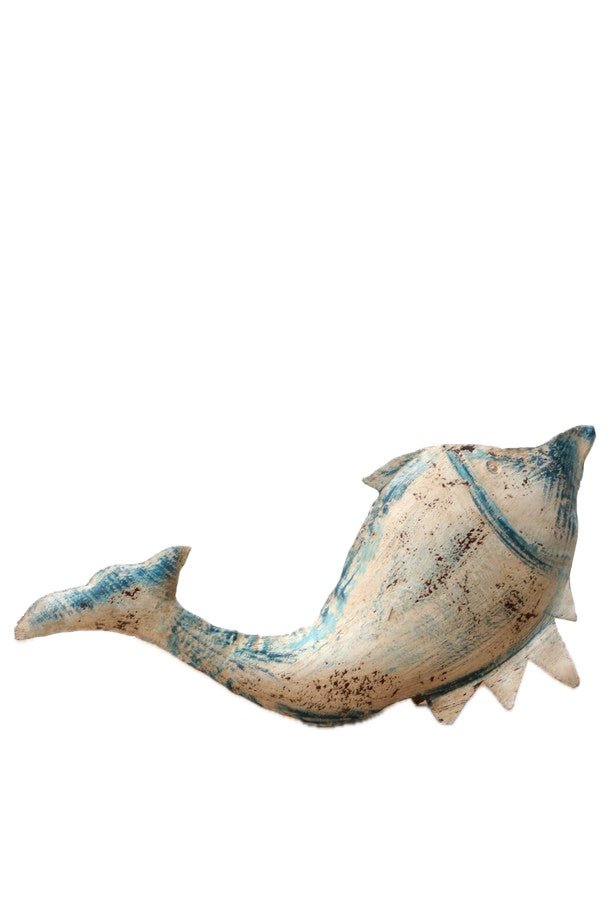 Decorative fish crafted from beige, blue, and brown iron, with a handcrafted finish that may show minor wear or surface rust characteristic of the material. Each piece is unique and may exhibit a varying degree of aging, a natural part of this collection's style. It stands on its own.