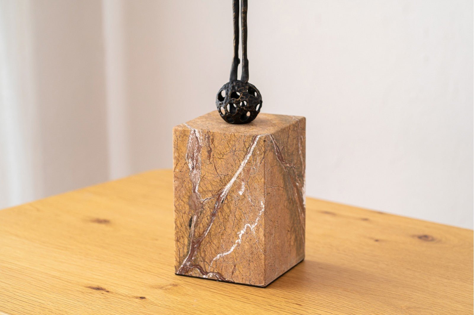 Sculpture made of metal with an aged bronze finish on a white marble base with grey veins.