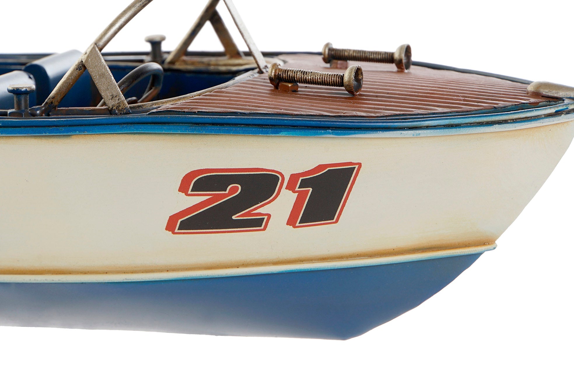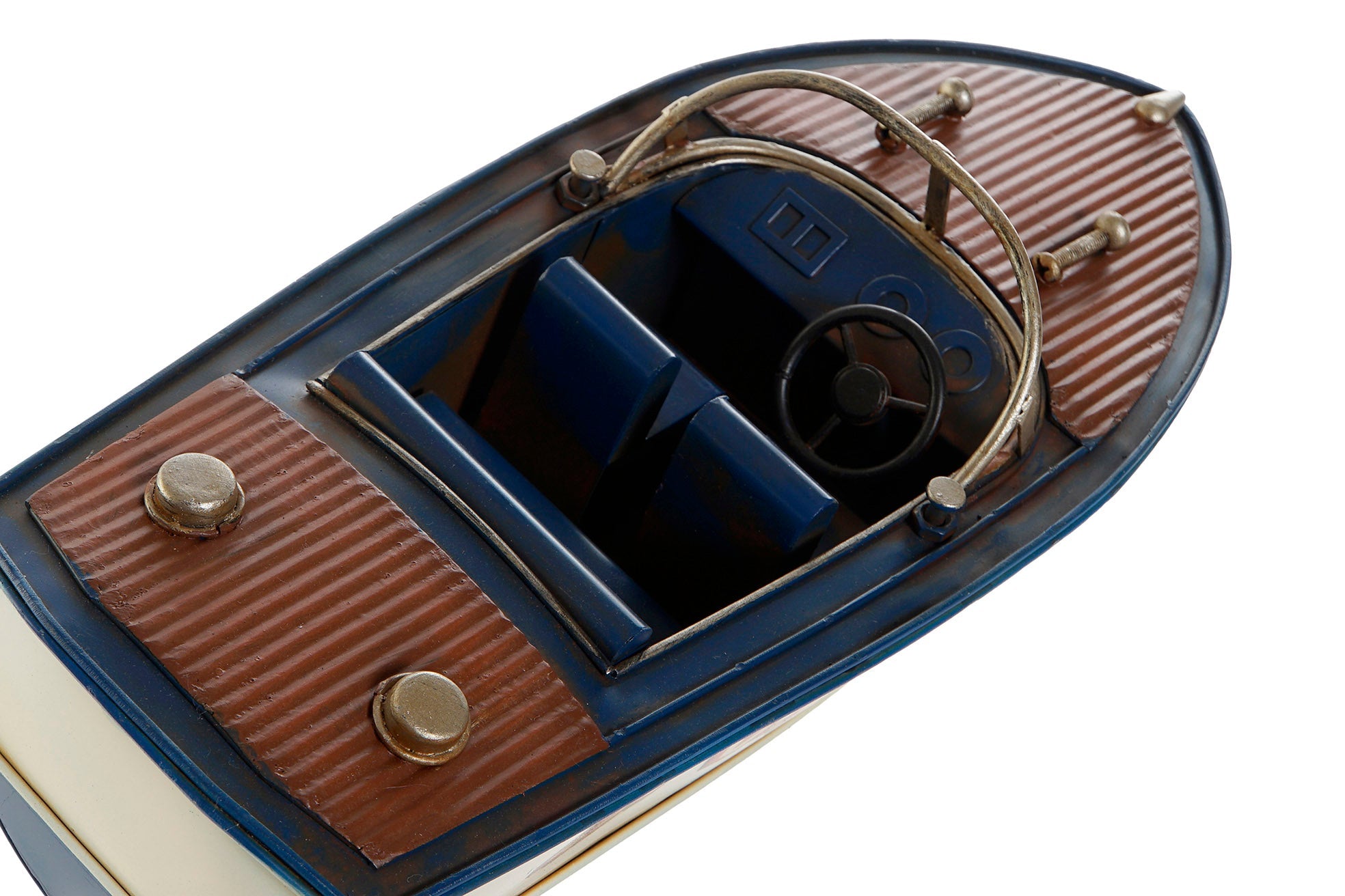 Beautiful decorative figure in the shape of a boat made of metal in white, brown and blue colors.