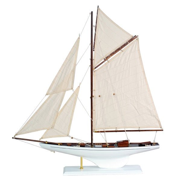 Beautiful decorative figure in the shape of a sailing boat made of white and natural wood.
