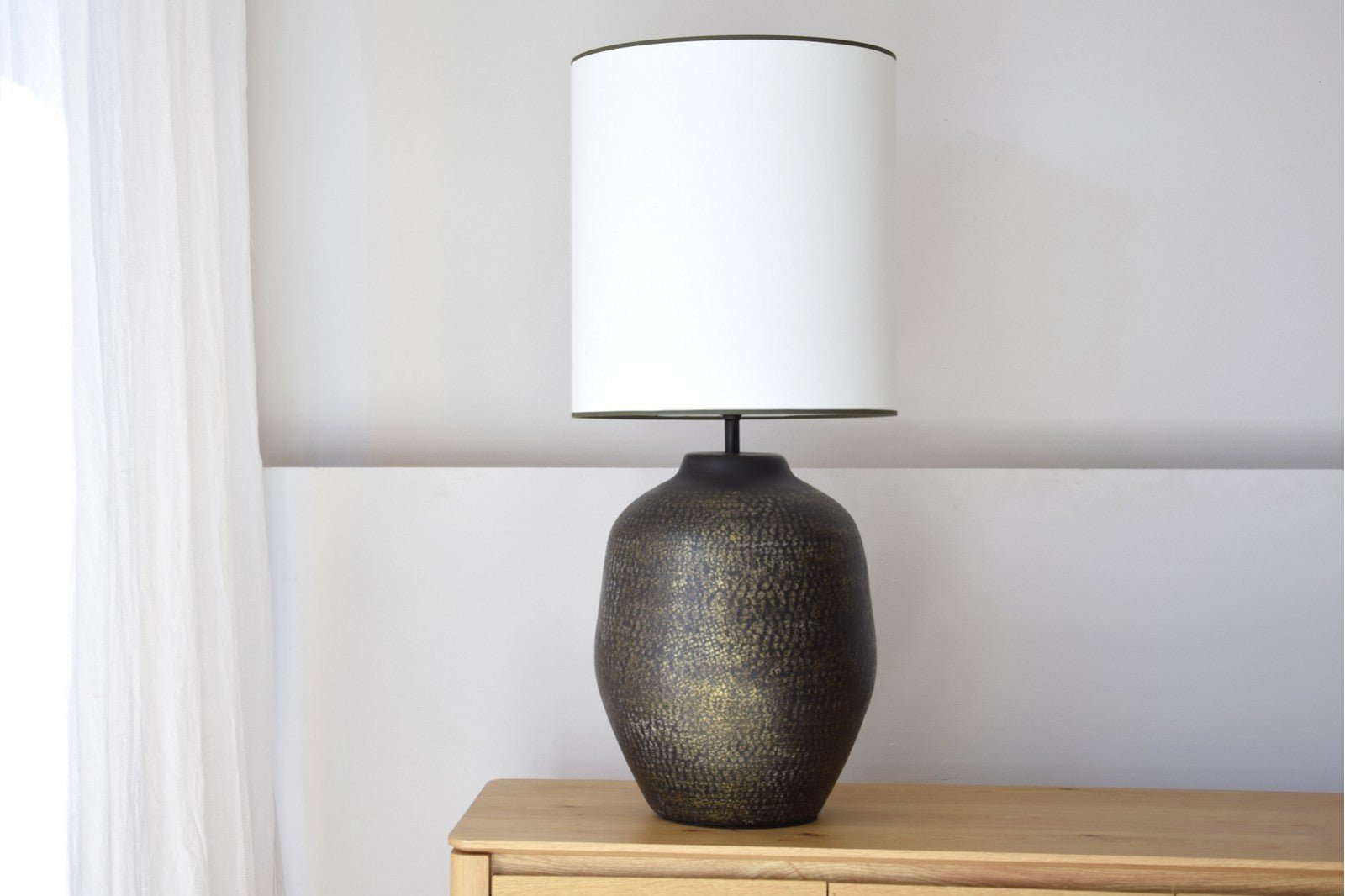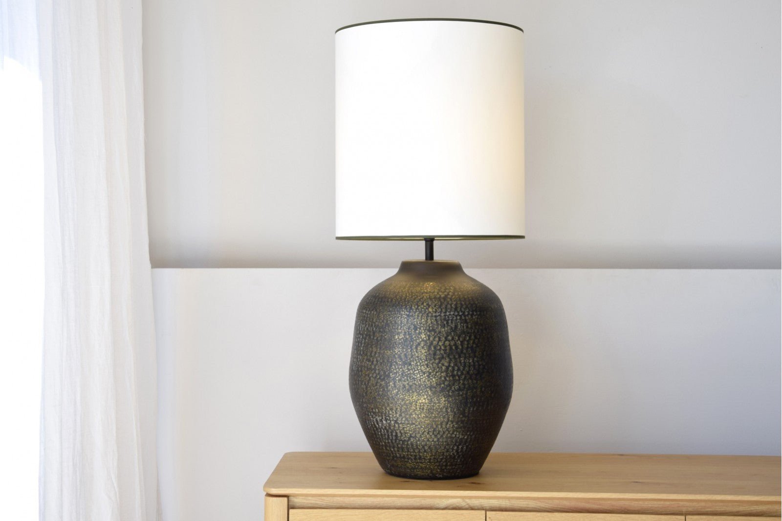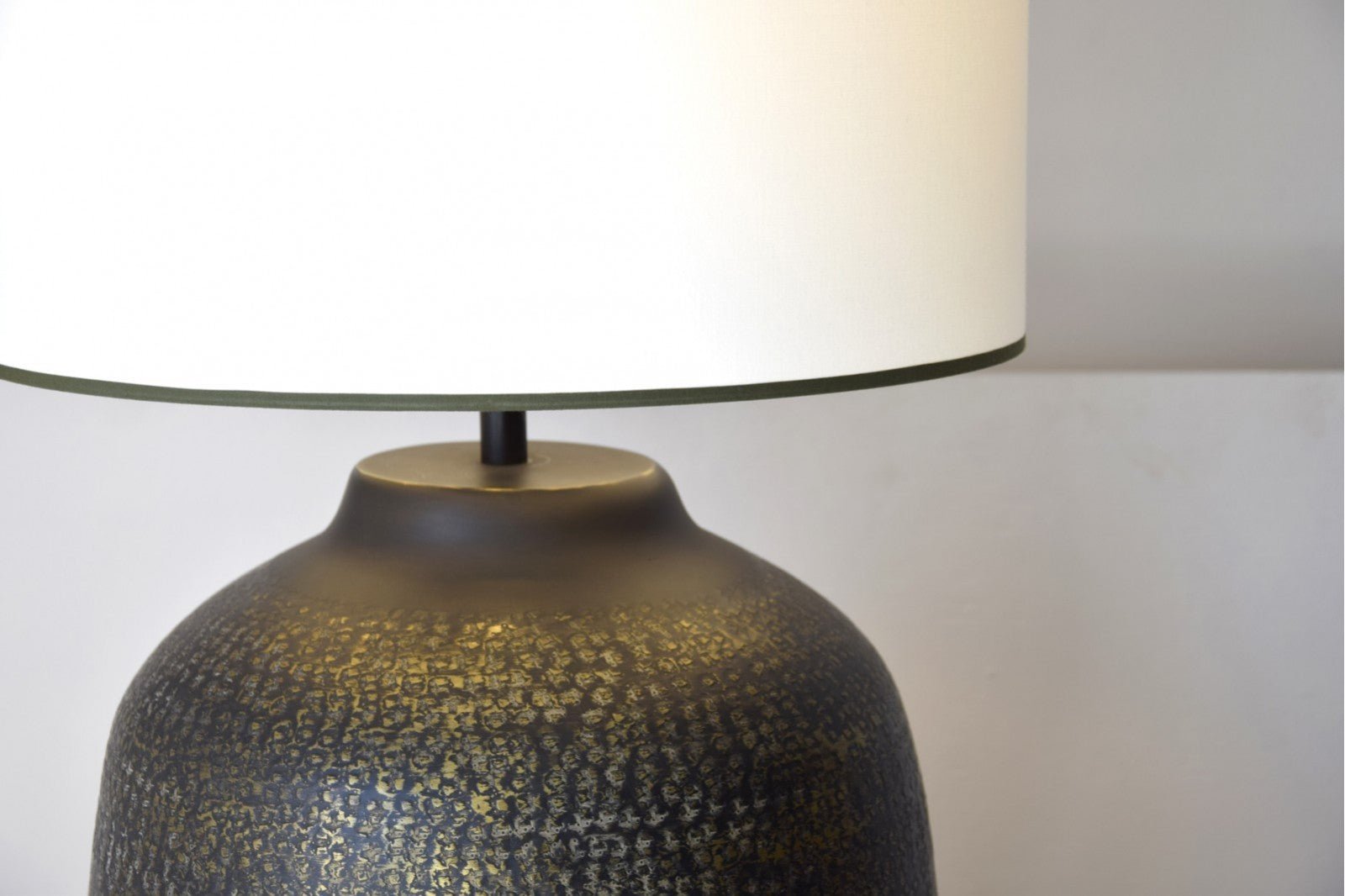 Table lamp made of aluminium with a black finish and antique gold details. The aluminium is hand-crafted. The cylindrical lampshade is made of off-white cotton with dark green edging at the bottom and top.