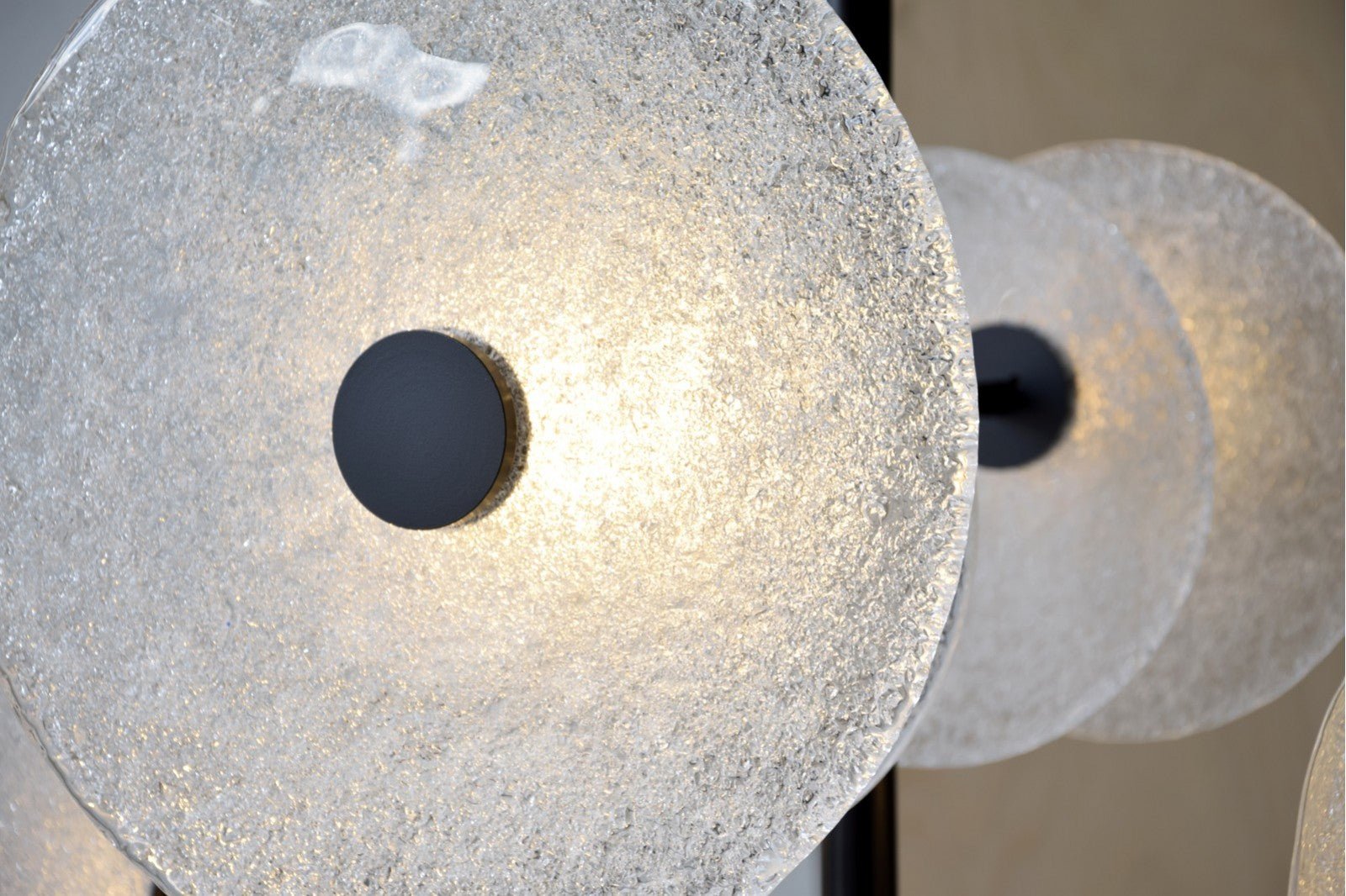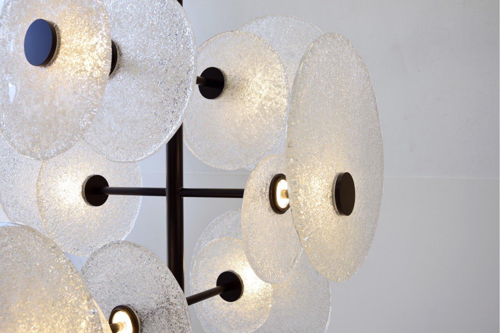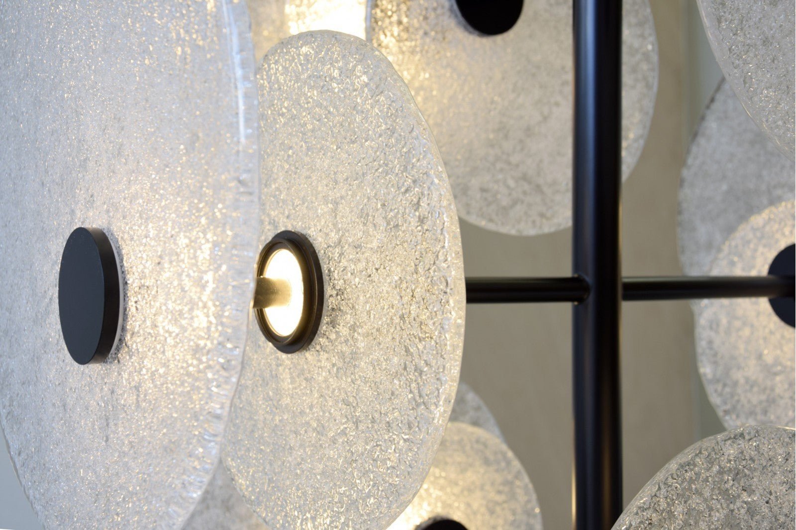 Magnificent ceiling lamp with a structure made of matte black metal rods with circular pieces in white glass of different diameters.
