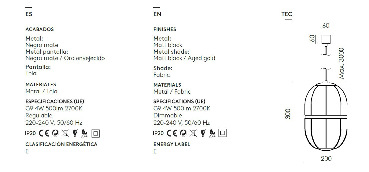 Bulb : G9 4W 500lm 2700K. Dimmable. Included.