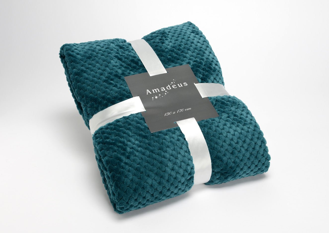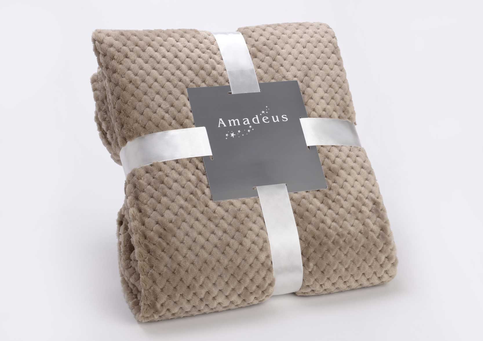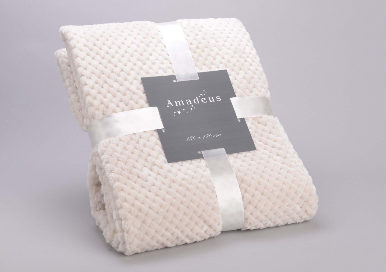 Beautiful and cozy blanket made of 100% polyester in emerald green, cream and taupe colors.