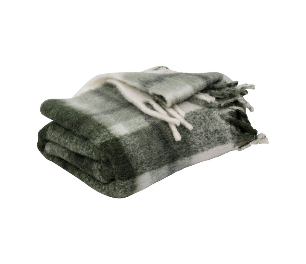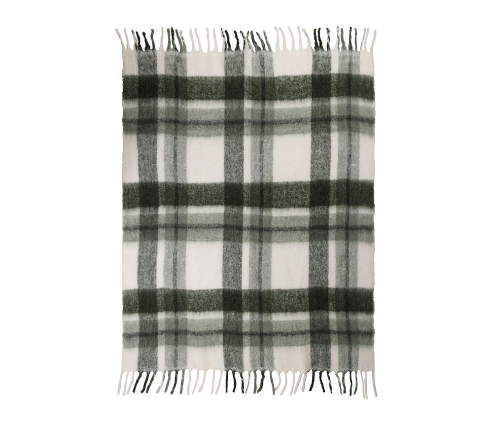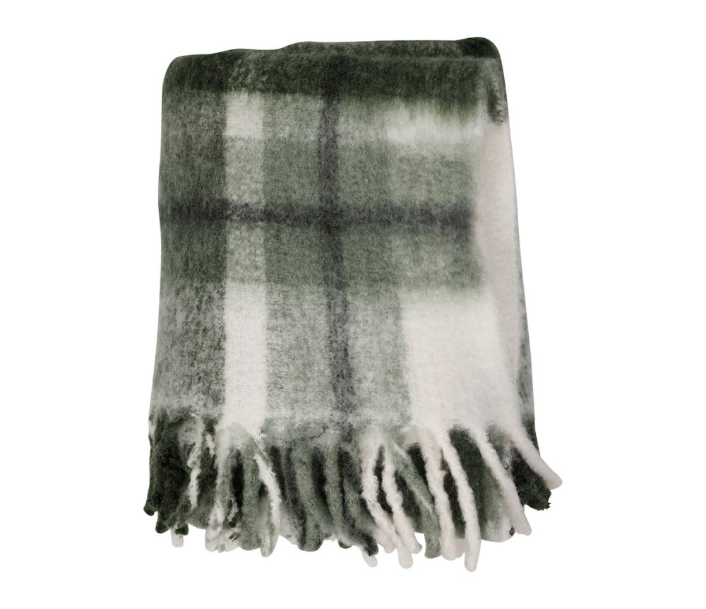 Wool plaid made of 25% wool, 55% acrylic and 20% nylon Mohair type with fringes, with a modern and contemporary design in trendy green color. Unique color, soft and cozy touch for a sophisticated and comfortable style.