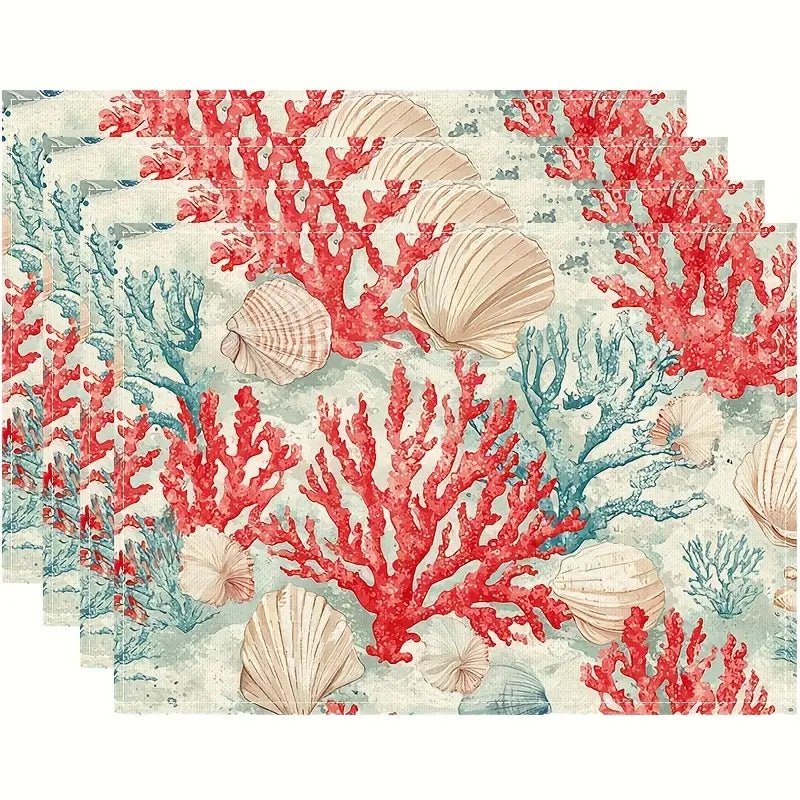Give your table a vibrant, nautical feel with this set of tablecloths decorated with large red corals, shells, and watercolor backgrounds. An ideal choice for coastal settings or to add a summery touch to any meal.