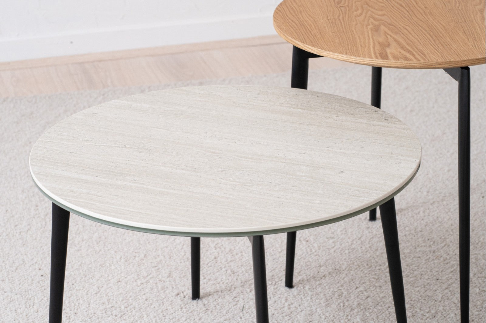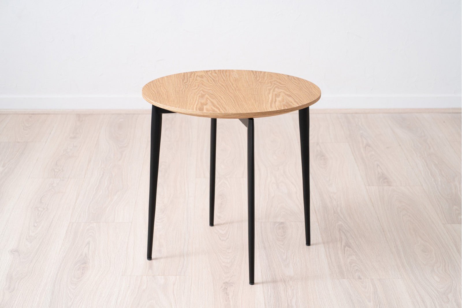 Round side table with a top made of MDF veneered in natural ash wood and matte black iron legs.